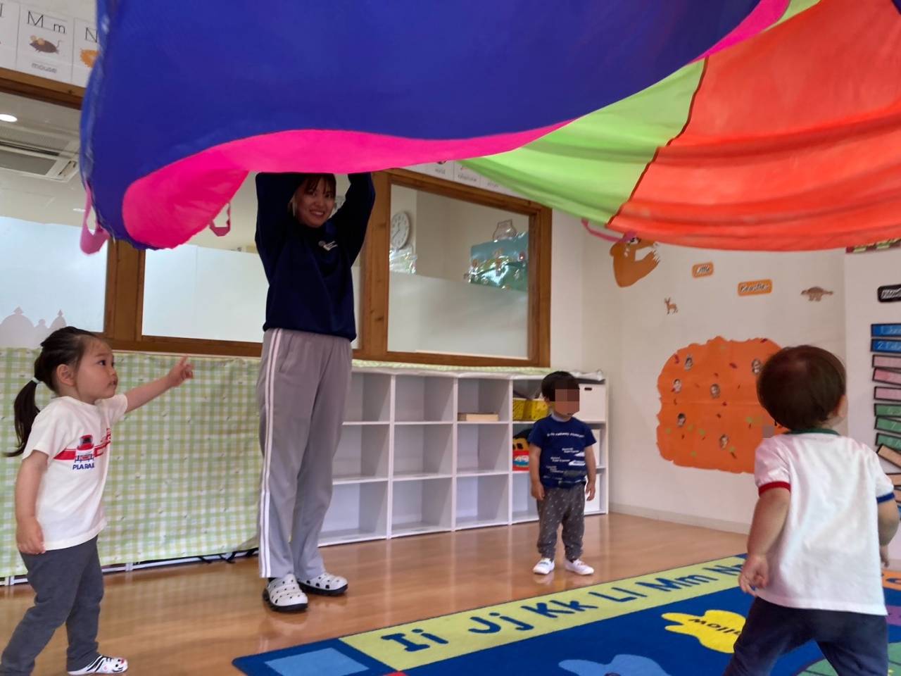 大きなパラシュートを広げてみんなで持ち、上げたり下げたり。