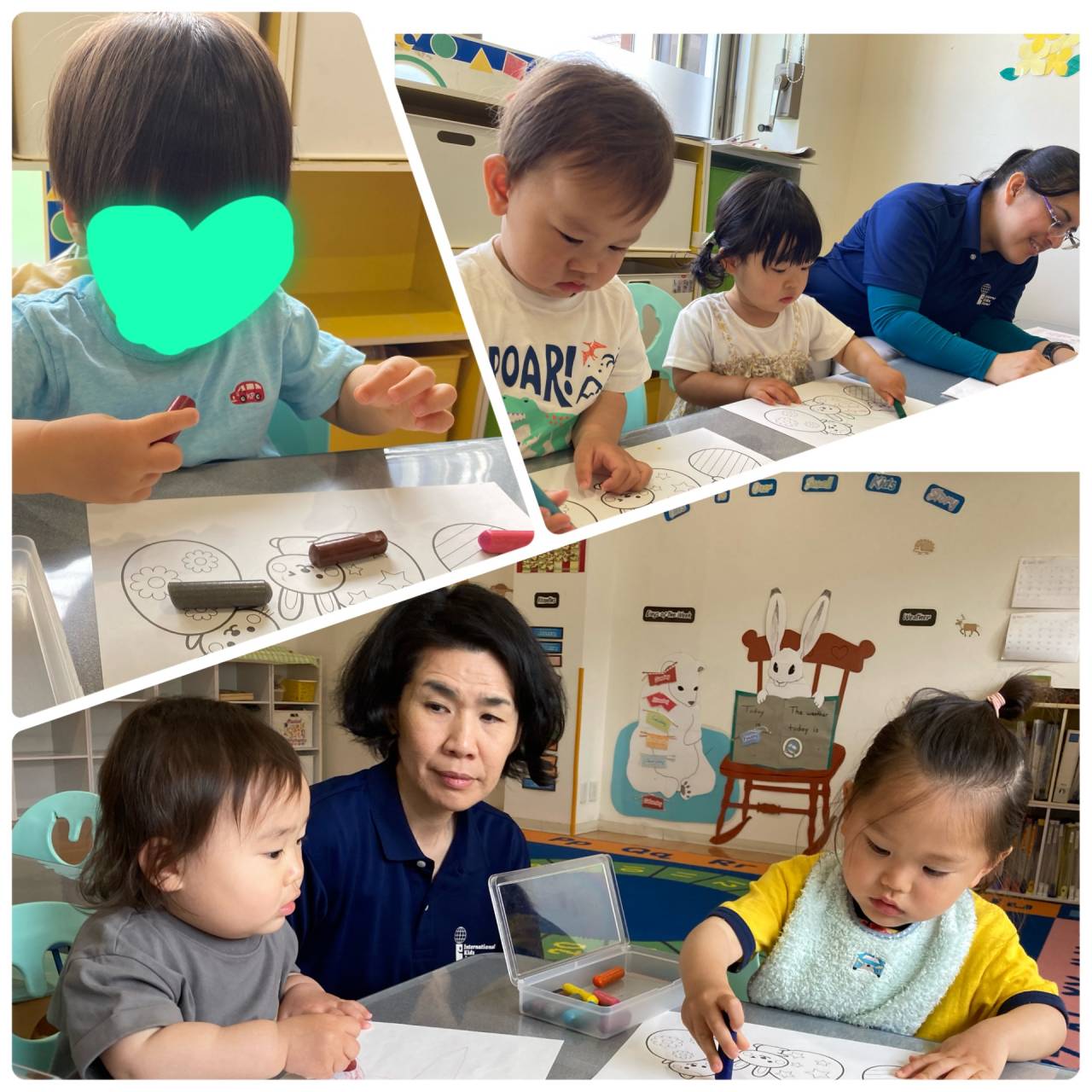 クレヨンを使って塗り絵をしました☆思いっきり塗る子、控えめに塗る子、まだなにしていいかわからずクレヨンで遊んでいる子