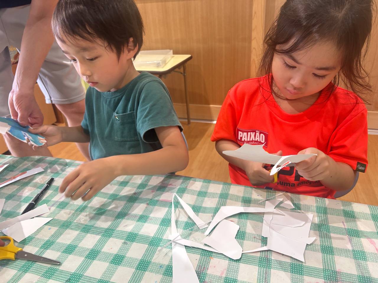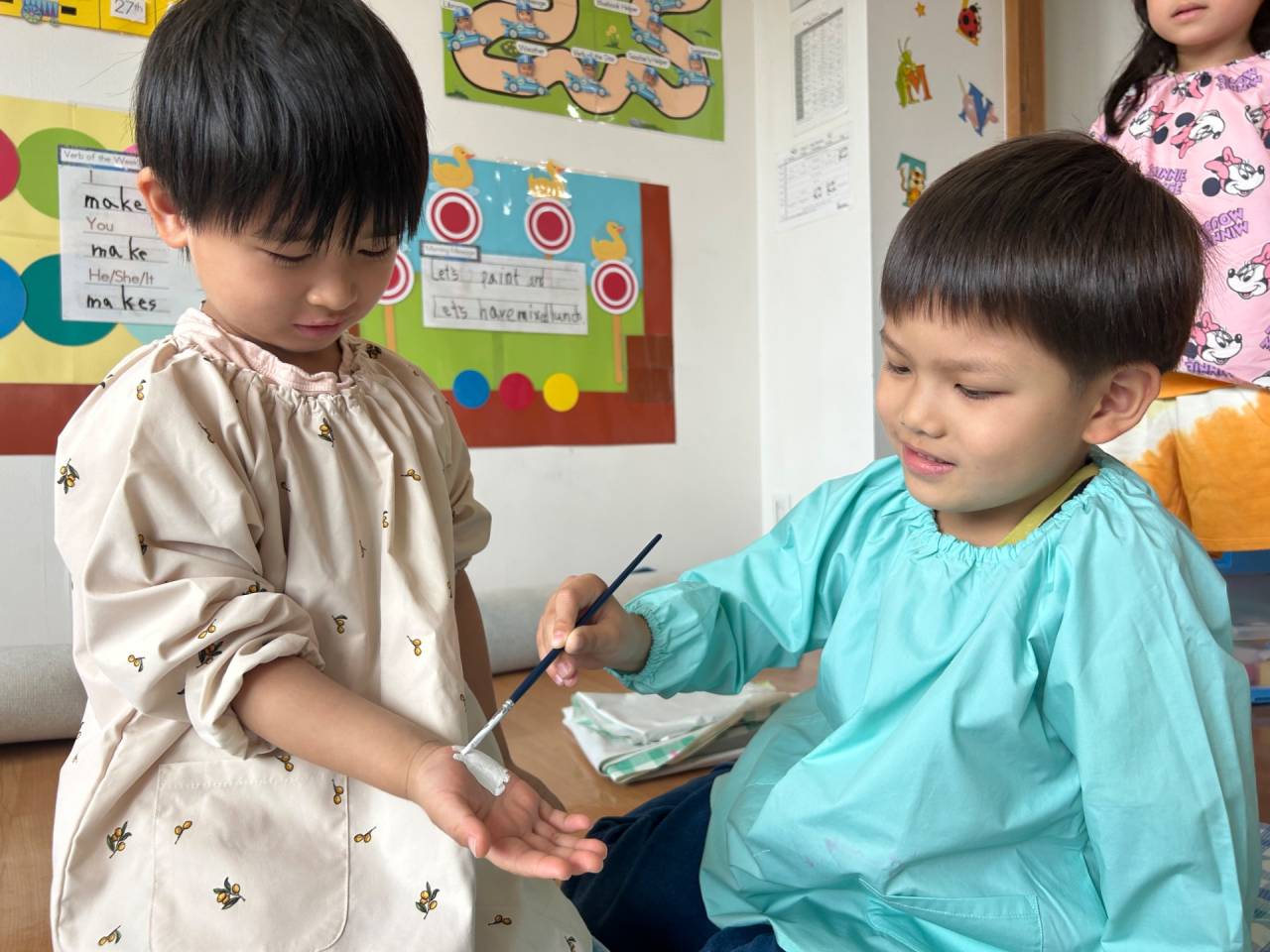 お友だちの手を押さえながら上手に塗れたね![]()