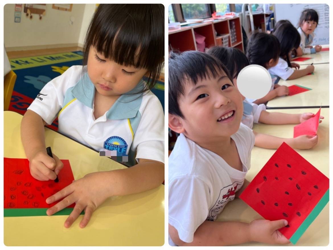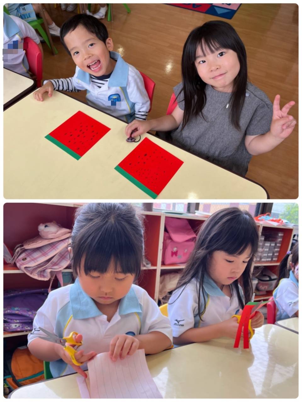 子どもたちがスイカの模様を描き、吹き流しを作りました!!