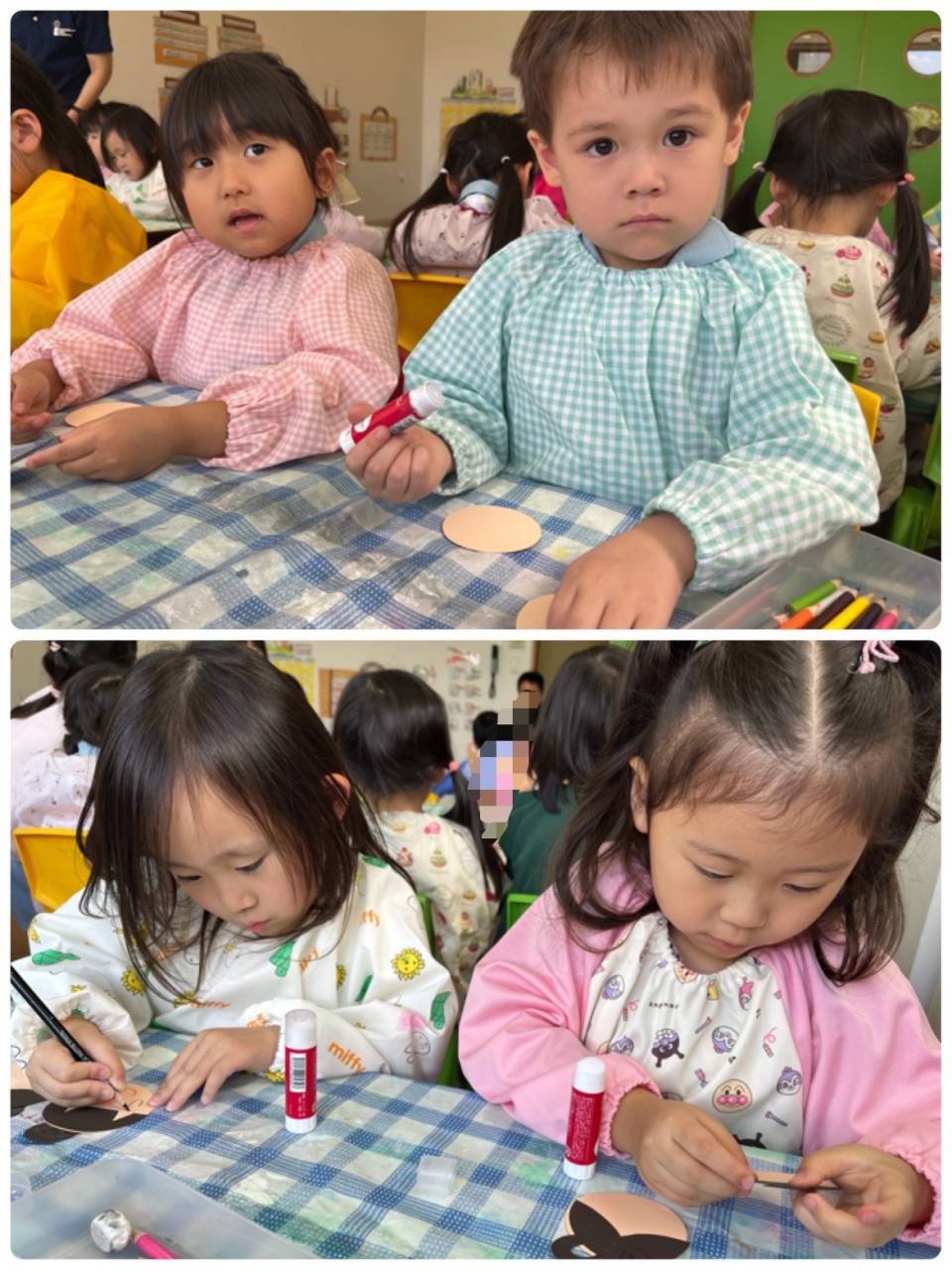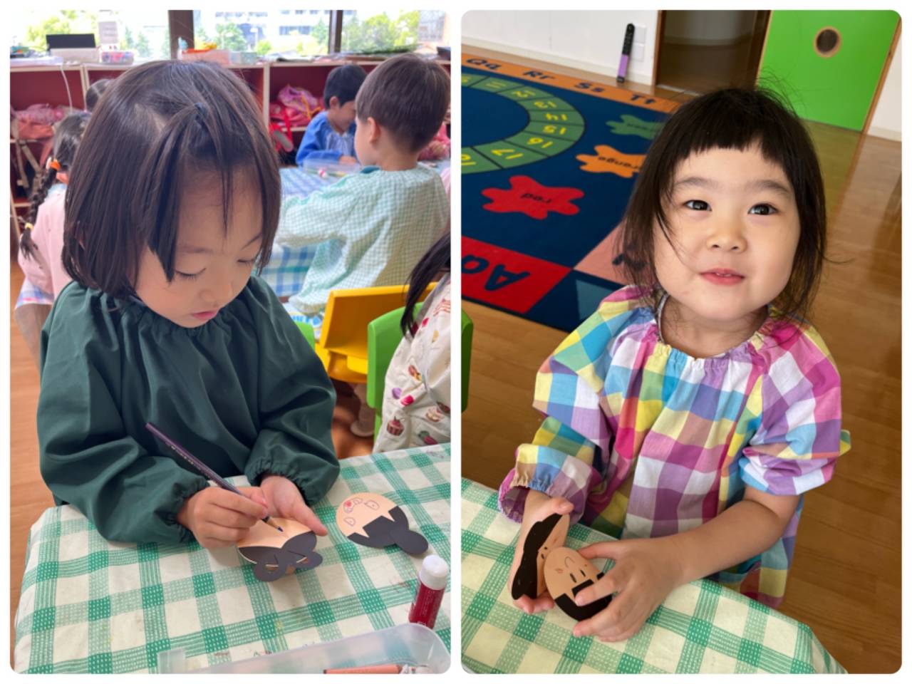 「どんなかおにしよう?」「みてー!かわいくできたよー!」と、子どもたちの会話も弾みます♪