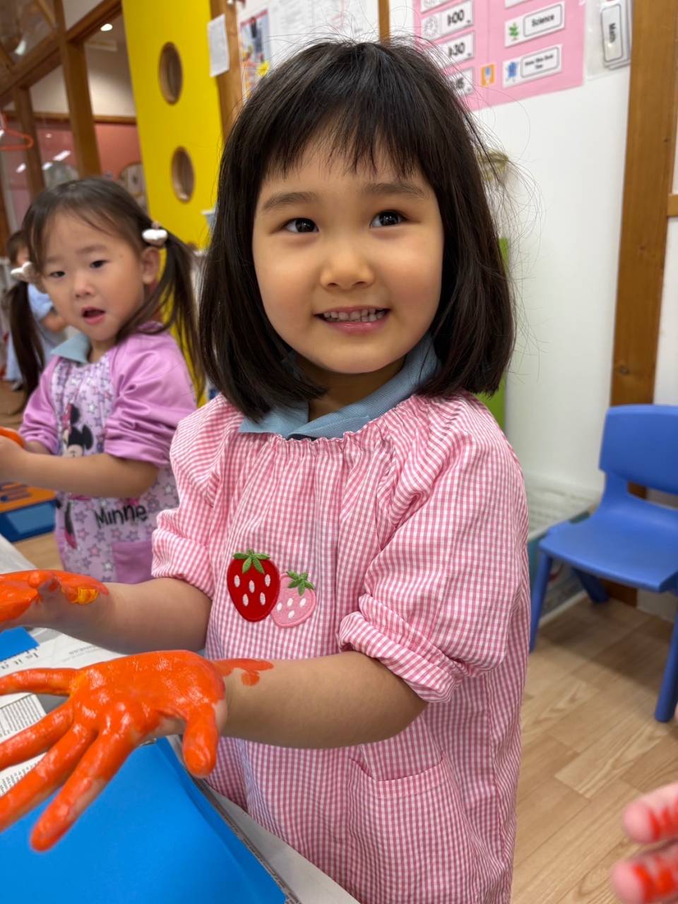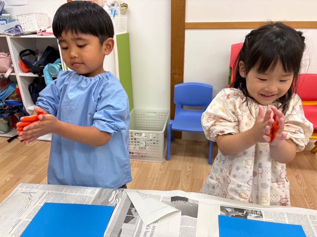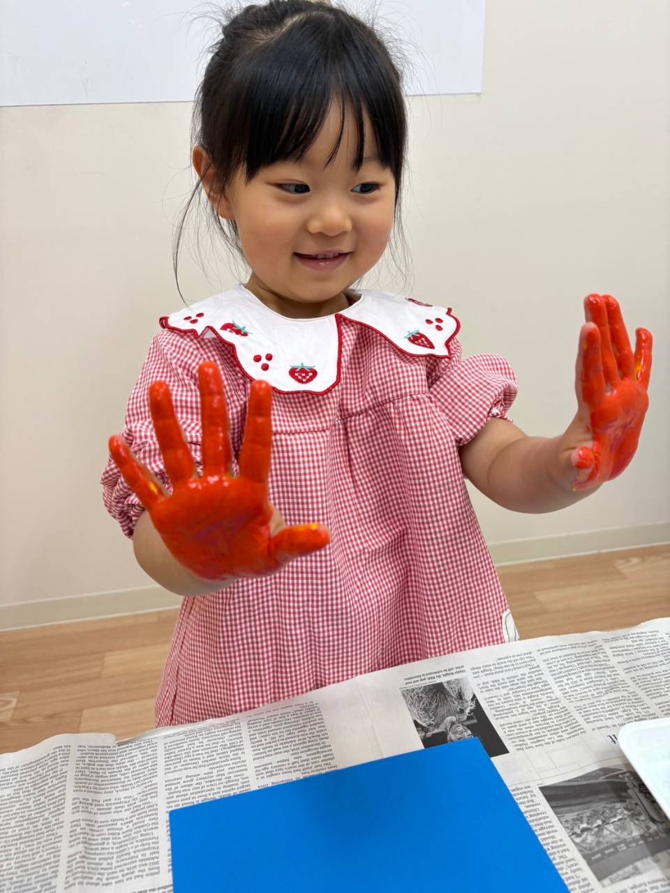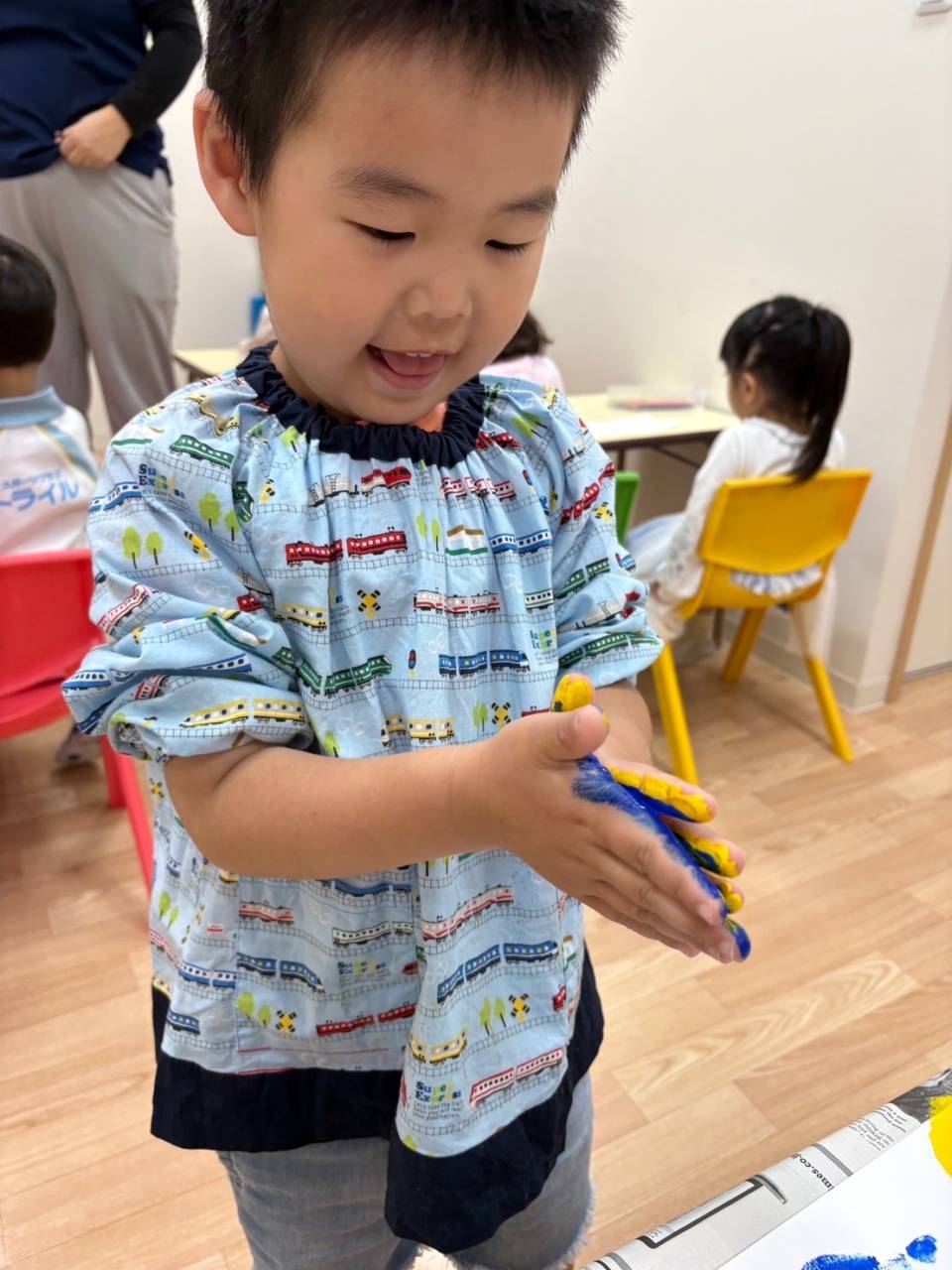 先生たちに筆で手を撫でられてくすぐったそうにしたり、手で絵の具を混ぜる感触を楽しんだり、みんな終始ニコニコ顔でした(^^)