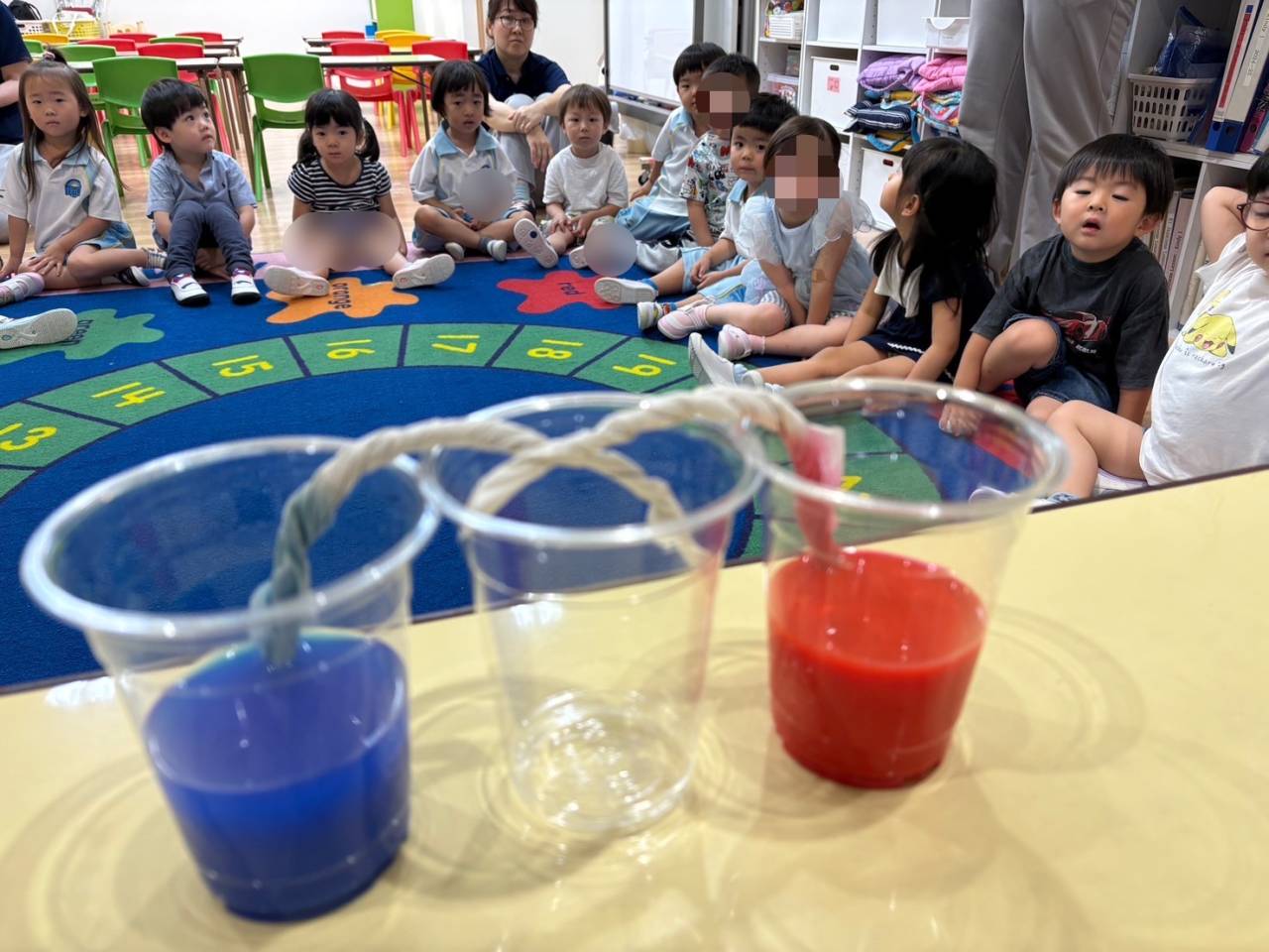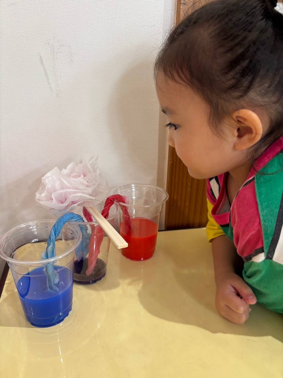 またまた別の日は、色水を使った実験に挑戦しました!使った色は赤色と青色。どんな結果になるでしょうか?