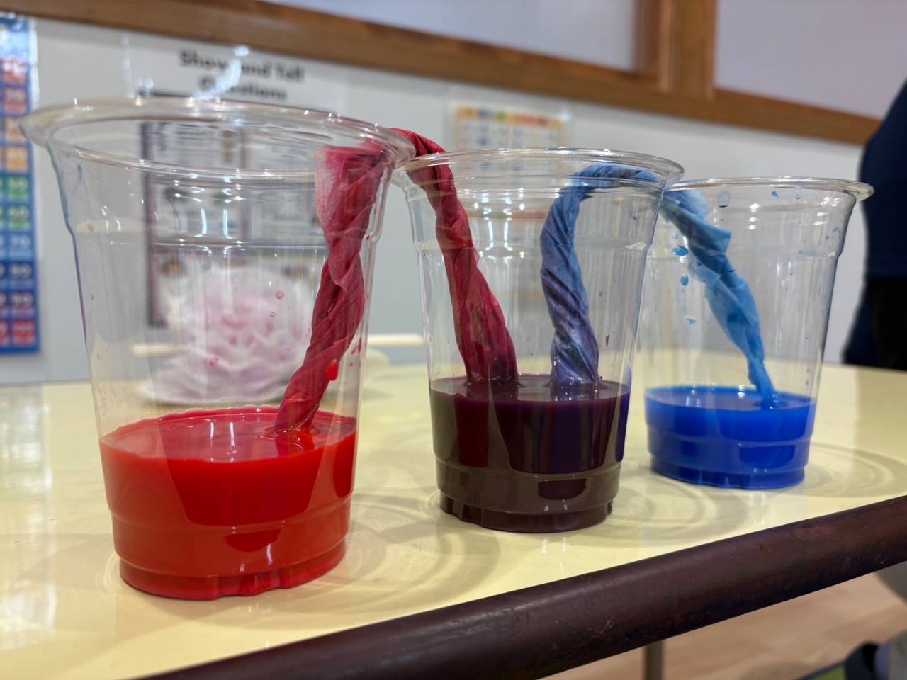 ペーパータオルを伝って、真ん中のカップに赤色と青色の水が少しずつ移動をしていきました。
