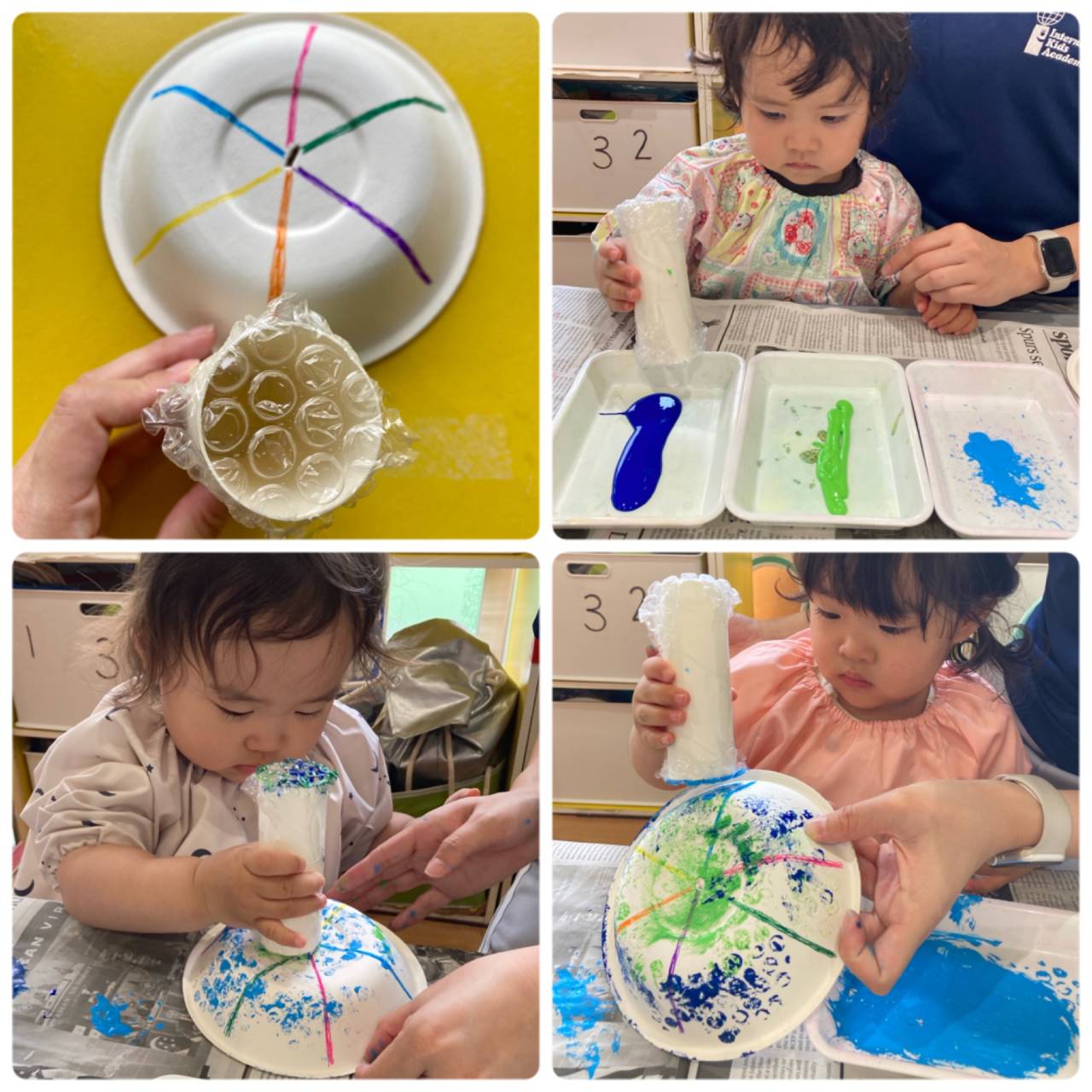 「Stamp stamp!」プチプチを使うと雨のような綺麗な丸が出来ると思いましたが、みんな絵の具を伸ばしたりして1人ずつ違う色々な模様がとっても上手に出来上がりました♪