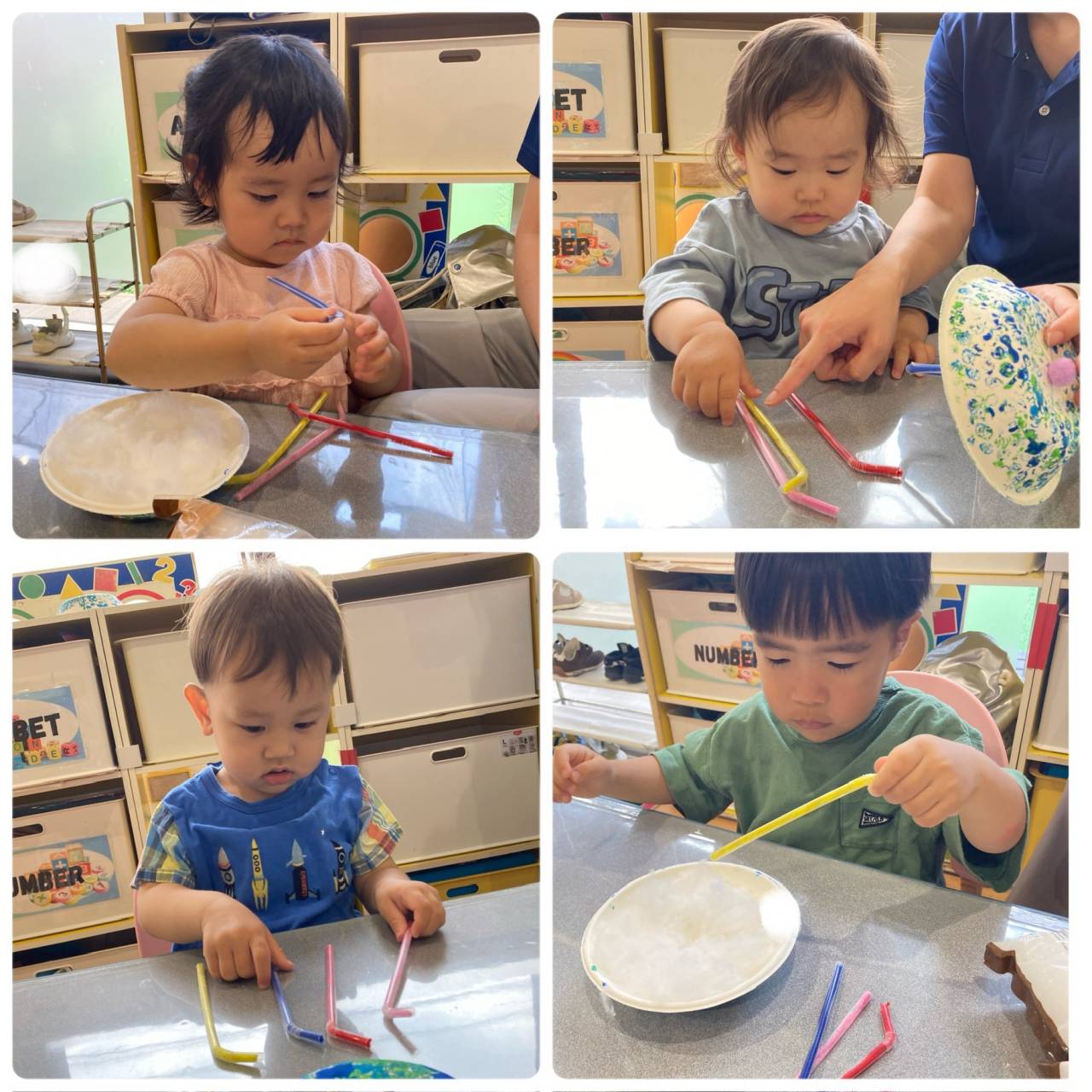 綿を内側に付けた後は、それぞれ傘の持ち手の色を選びます。今回は、ストローにモールを入れて傘の持ち手にしました☆みんなそれぞれ自分の好きな色、その時の気分の色を選んでいました♪