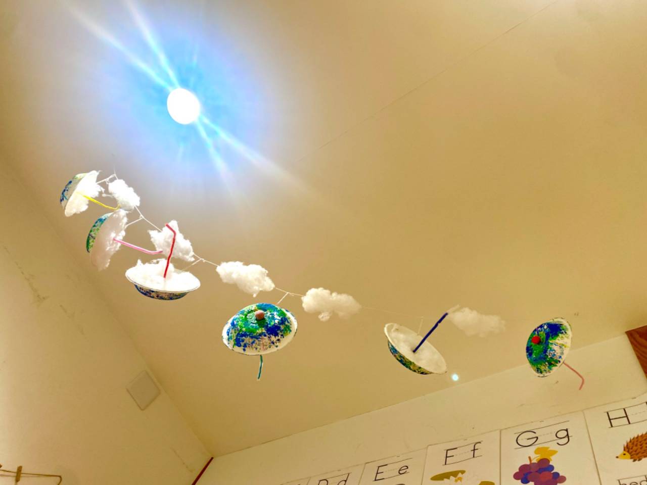 みんなが頑張って作ったかわいい傘は、綿の雲と一緒に教室の天井に飾ってあります