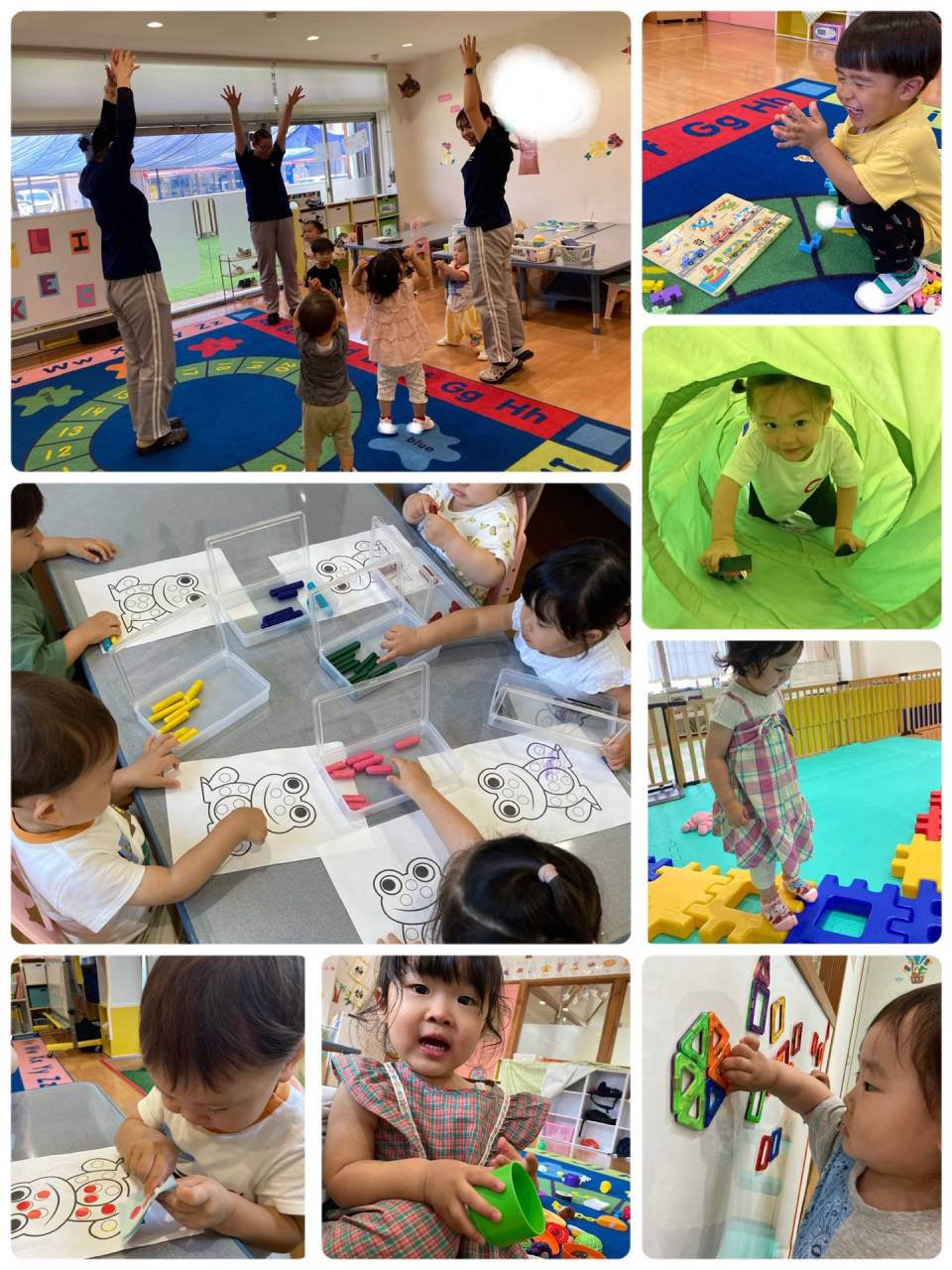 雨の日は室内で、ヨガ、パズル、トンネル、色塗りなど色んな遊びをして楽しんでいますよ☆