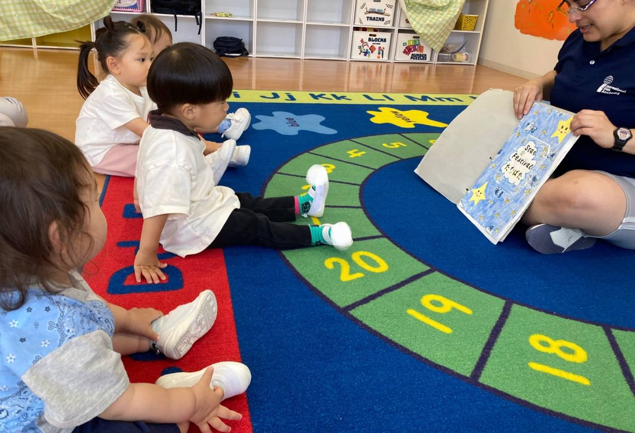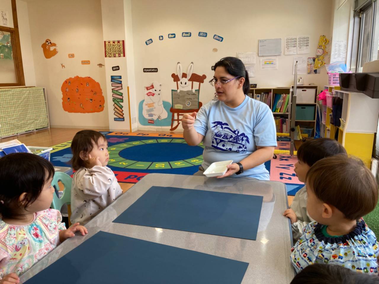 お星様をキラキラにしたあとは、青い画用紙にみんなのかわいい指紋を使って、天の川のような模様を作ります!どうやってやるのかな?まずは先生の説明を聞いてやり方を知ろう!みんな指でTapするんだよ〜♪
