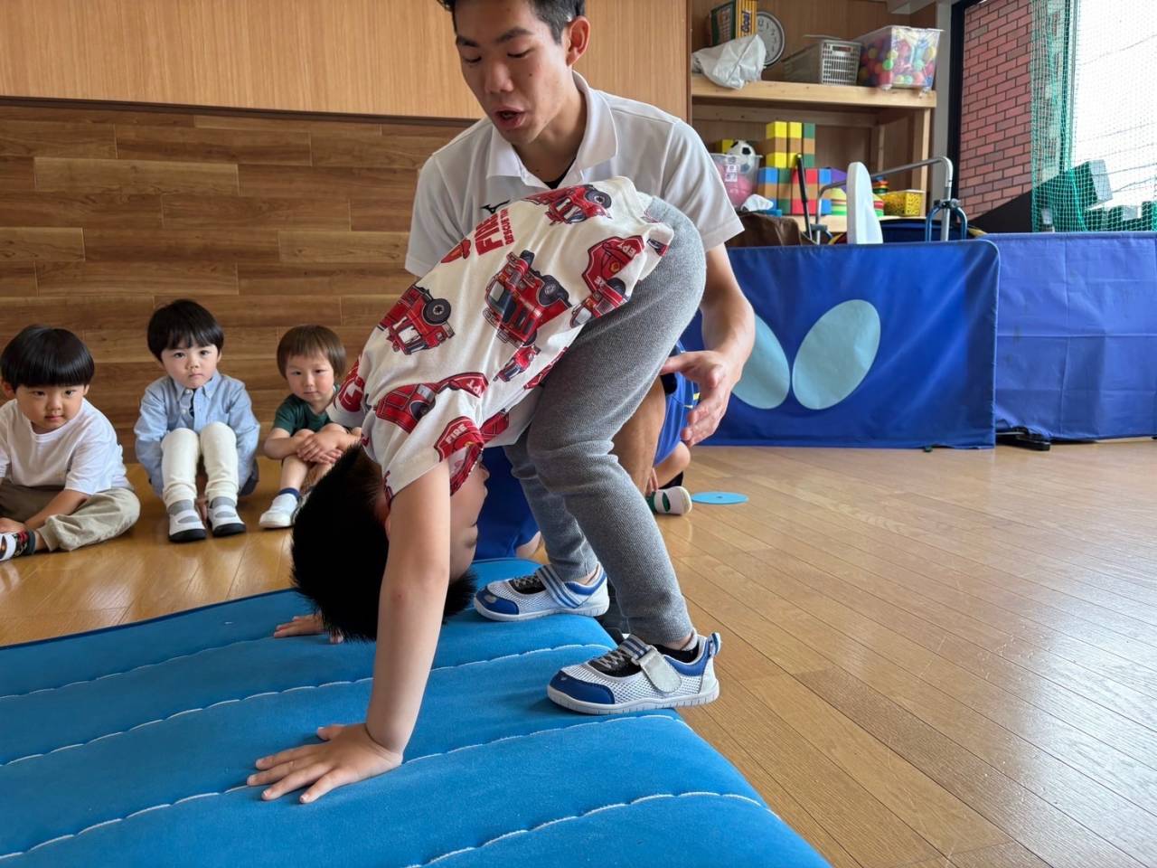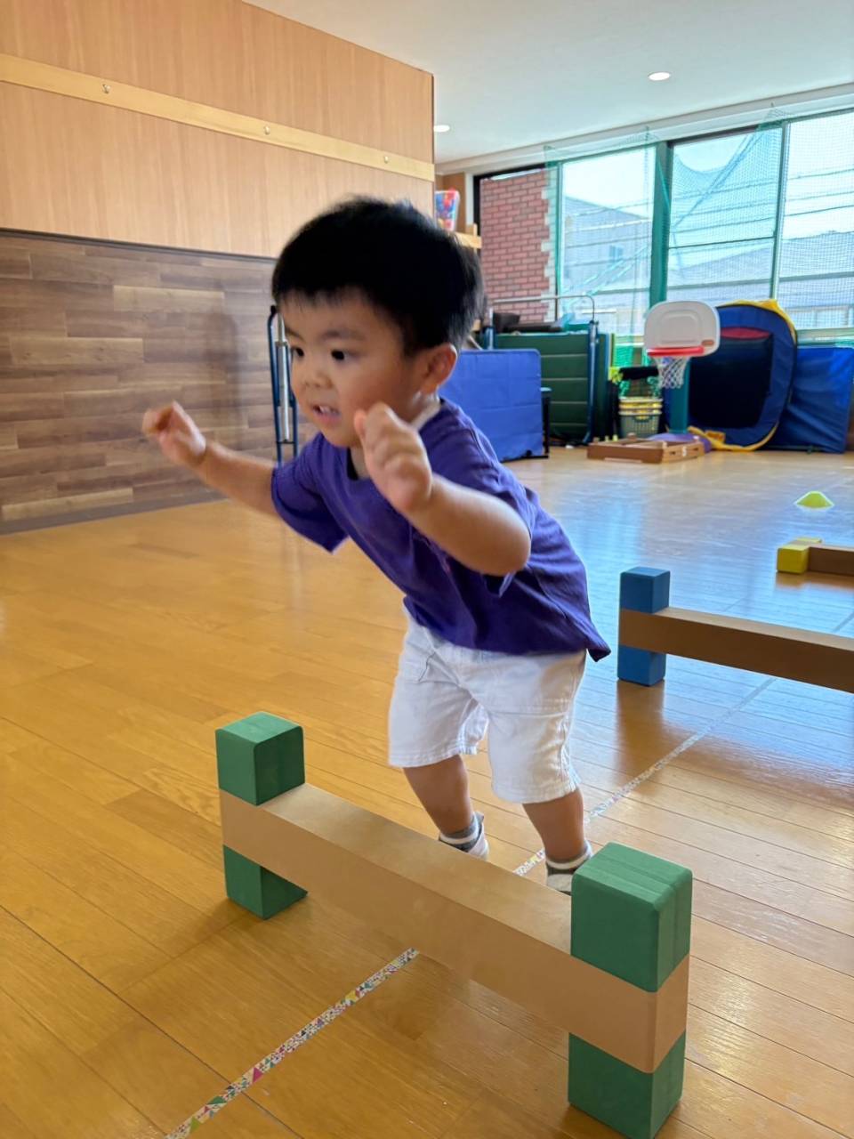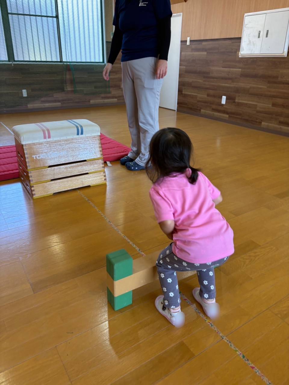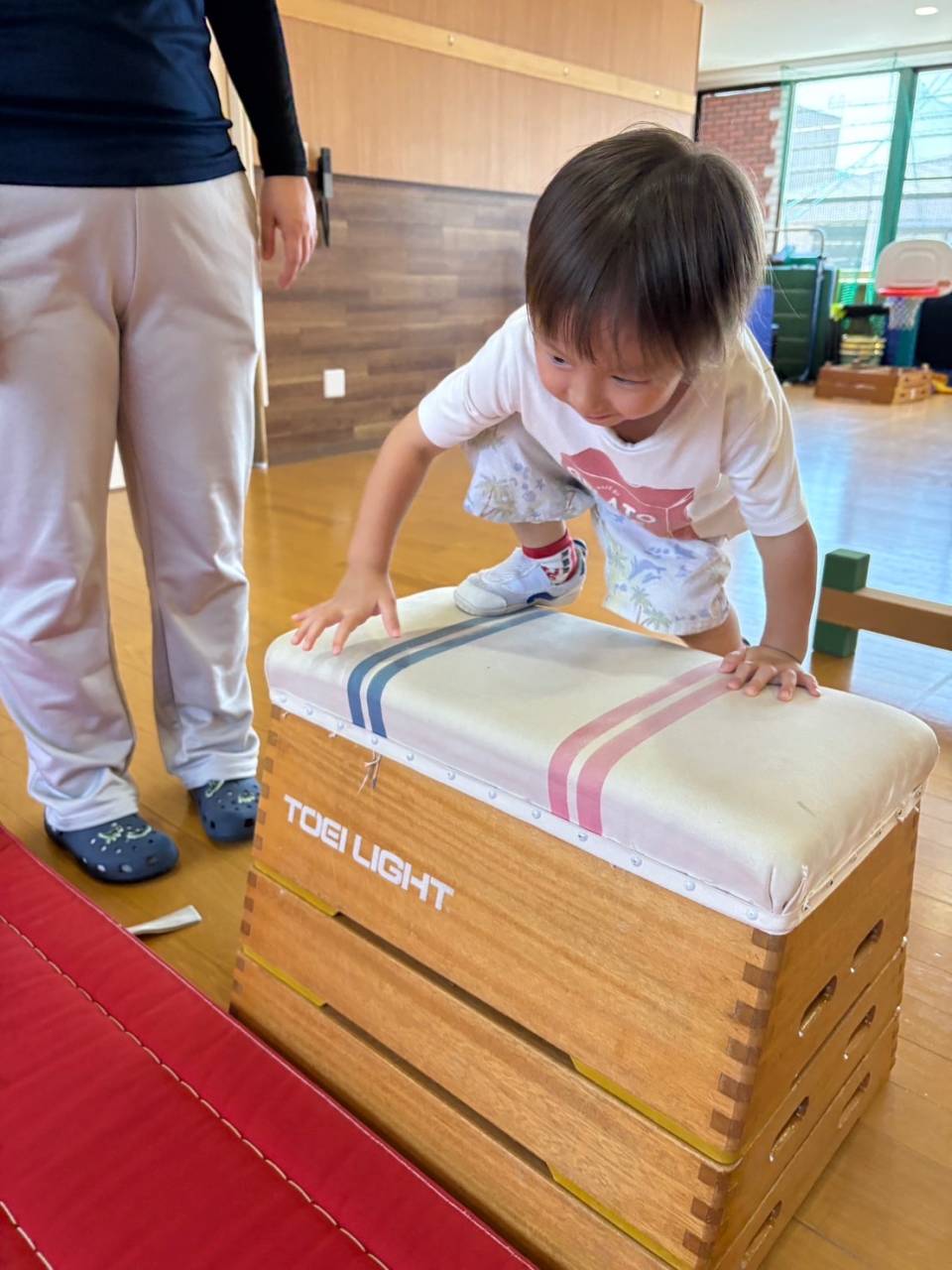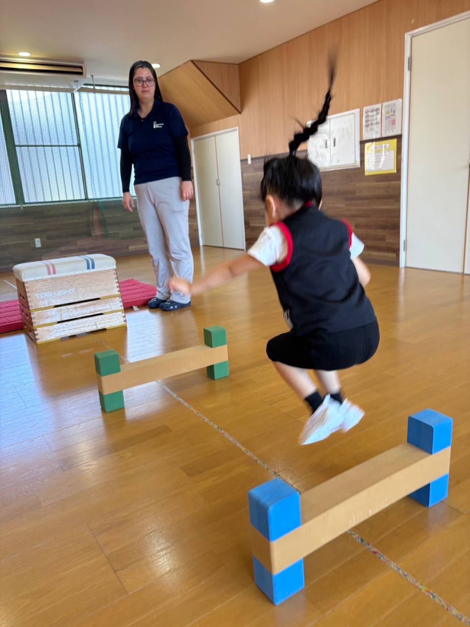 上に登ったらまた足をしっかりとそろえてジャンプ!着地は手をついてしまったり、バランスを崩してしまうこともありますが、たくさん練習をしてしっかりと足がつけるようにしていきたいね!
