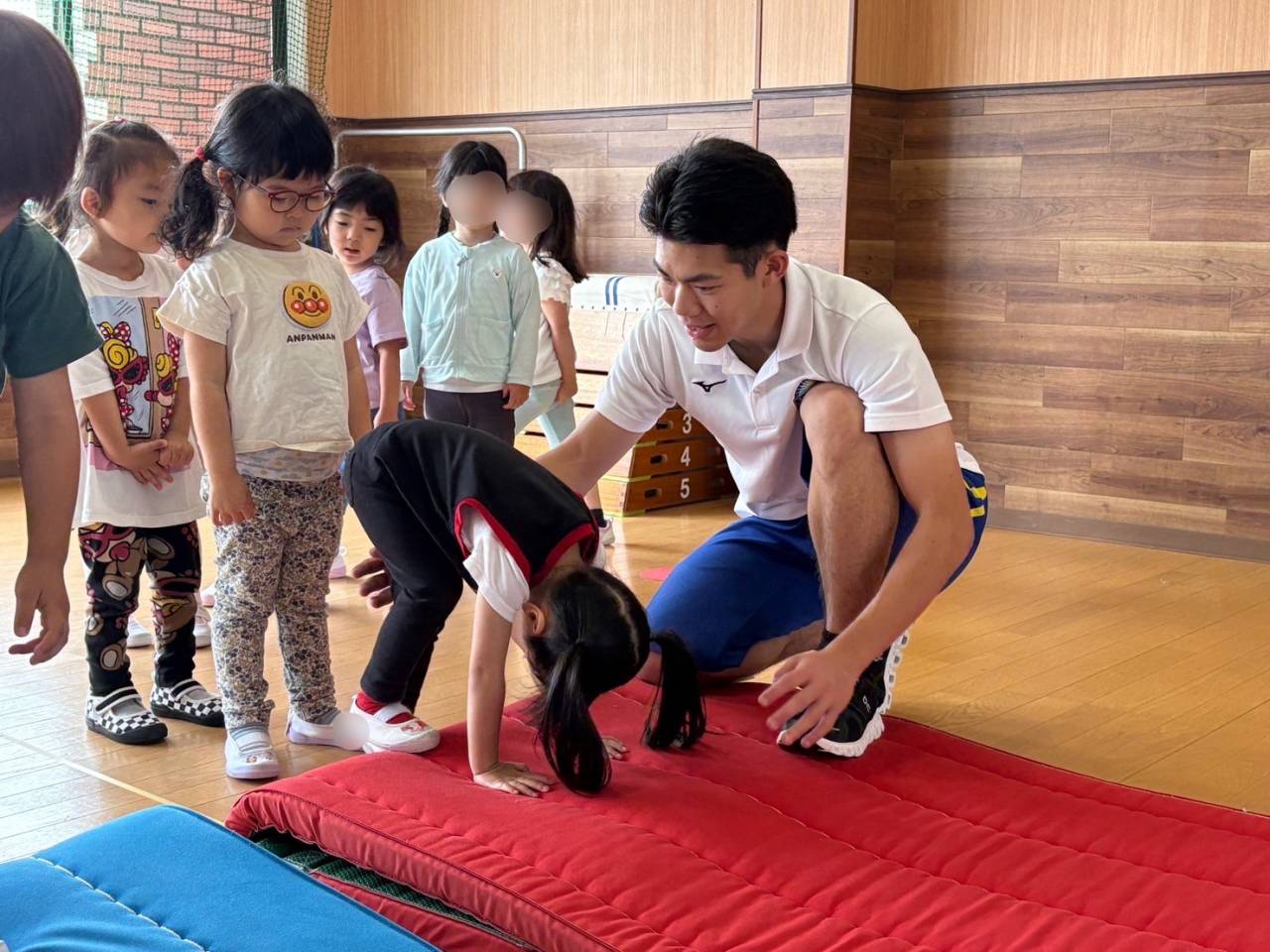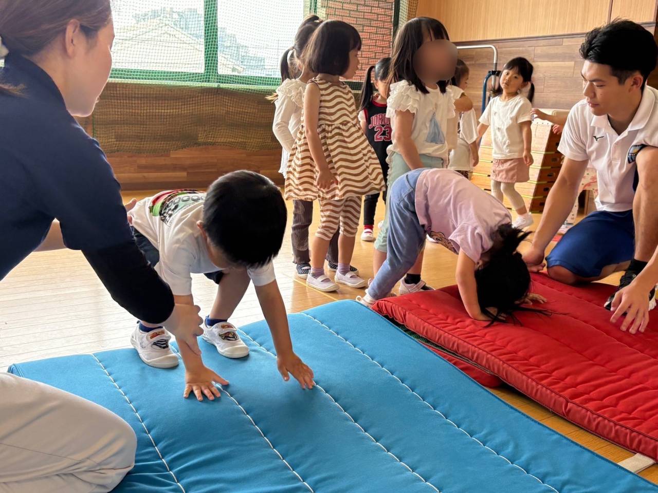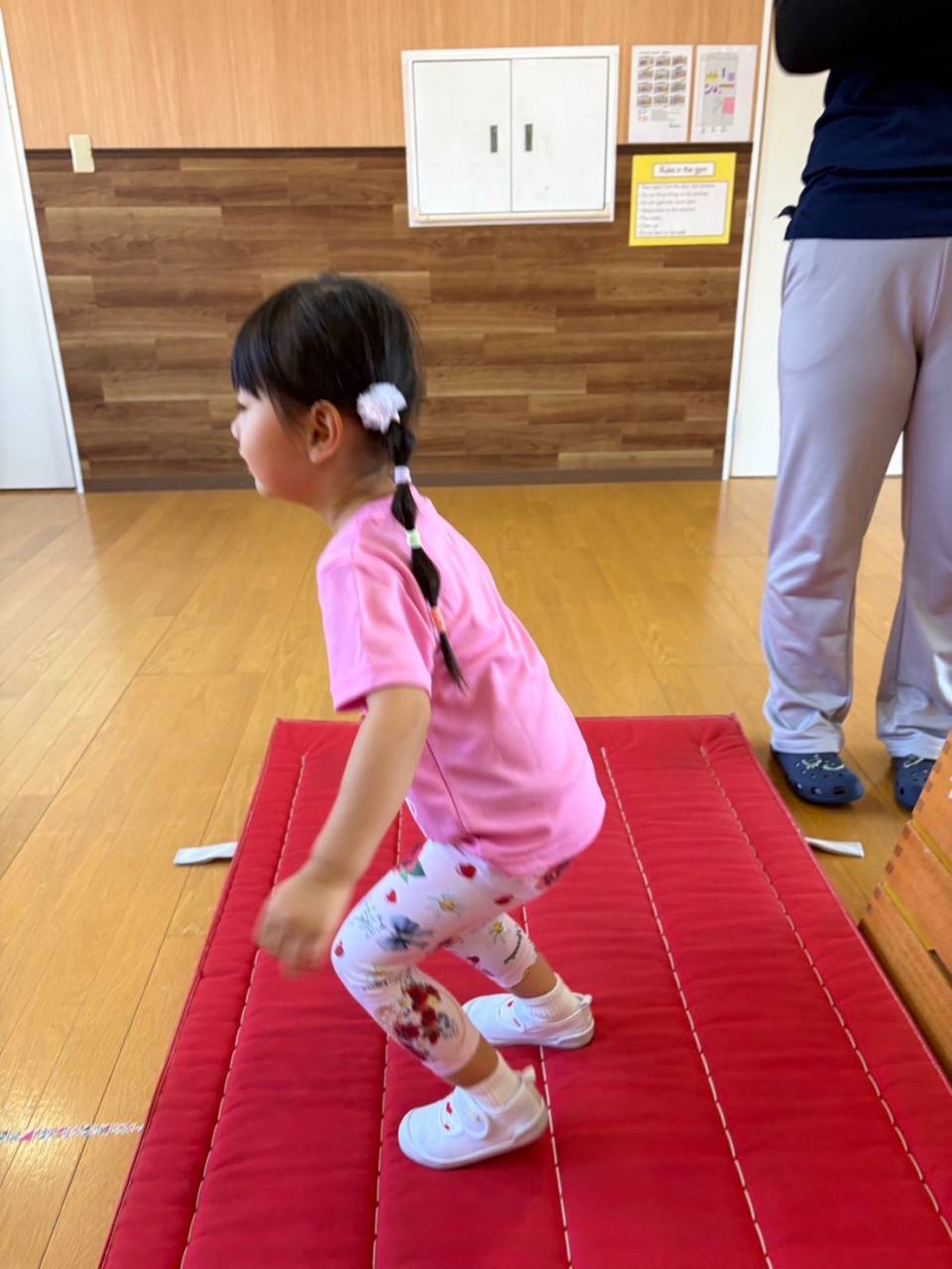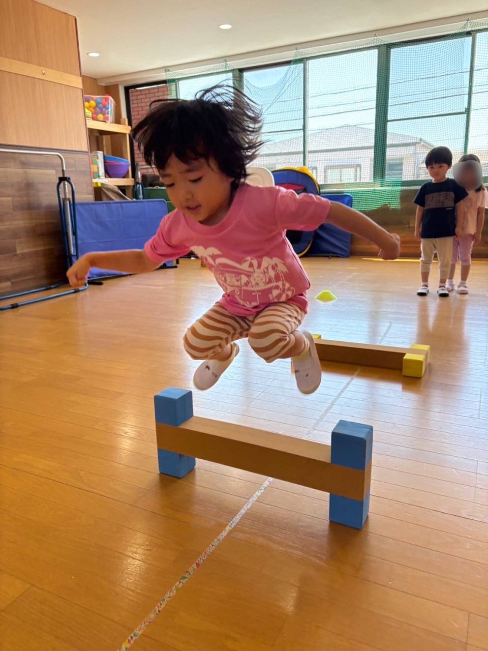 今回はジャンプを重点的に取り組みました!両足をそろえて跳ぶことや、着地をするときは手をつかずに足だけで着地することなどに注意しました。