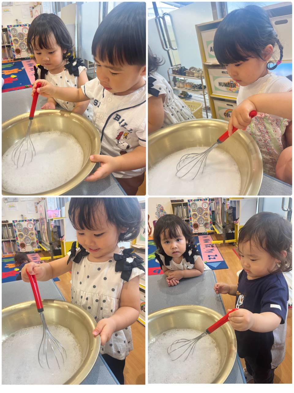 We began by watching the teacher make the foam using warm water and a few squirts of shampoo. Then we helped whisk everything together to create a big bowl of fluffy bubbles.