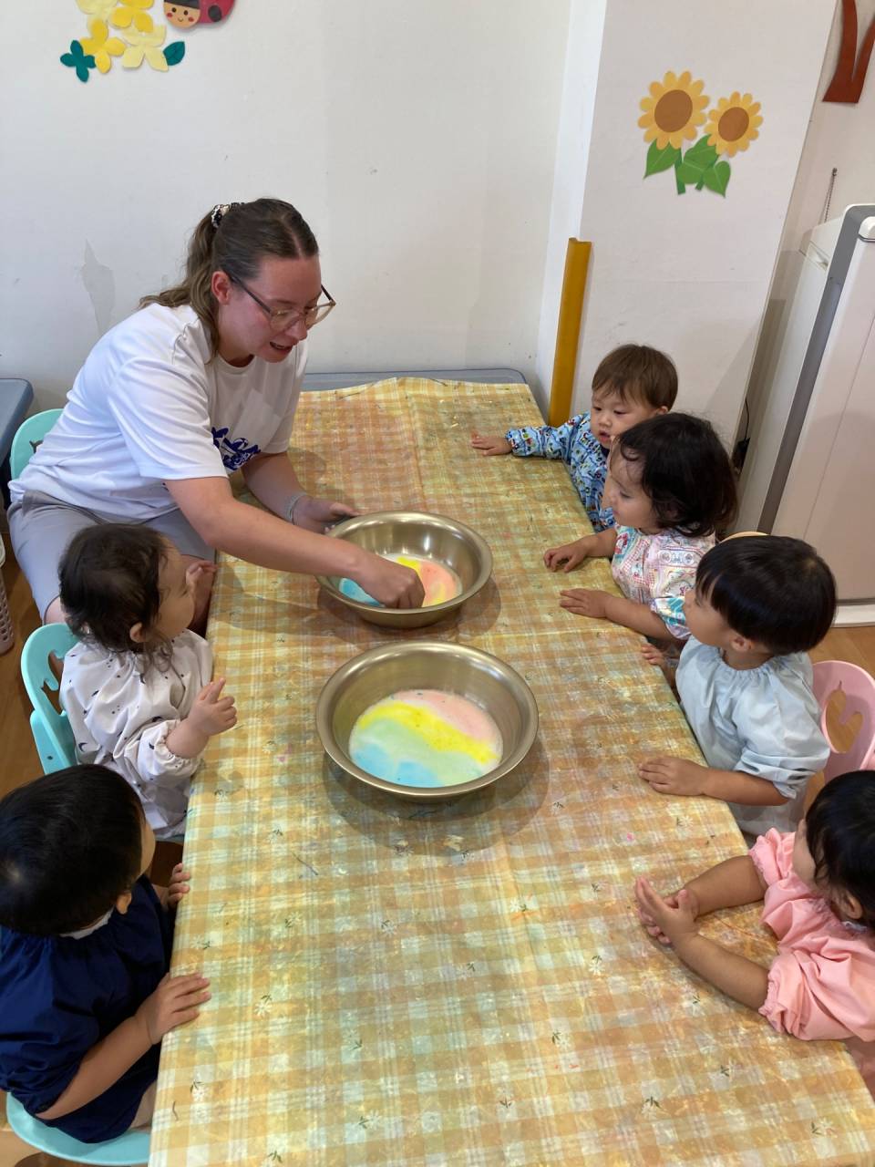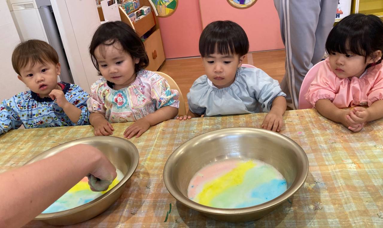 Next, our teacher added drops of food colouring (red, yellow, green, and blue) transforming the white bubbles into a bright and beautiful rainbow. Some of us could even point and name the colours, calling out “blue!” or “yellow!”
