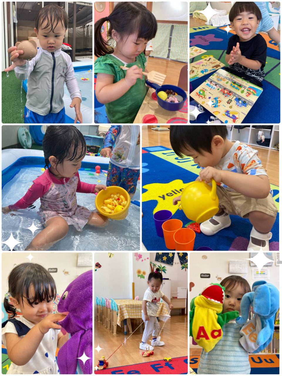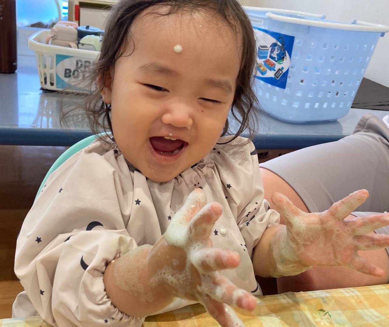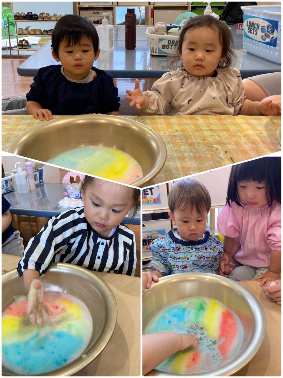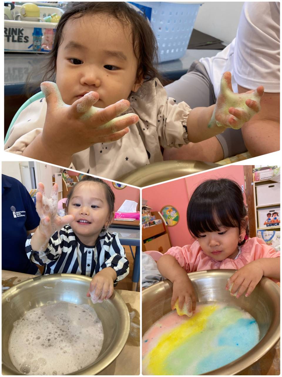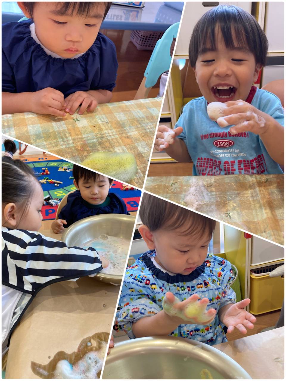 Some of us gently dabbed the foam with their fingertips, while others liked to put their whole hands in. Our teachers asked us, “How does it feel?” We heard words like “wet,” “soft,” and “bubbly,” and some of us tried repeating the new words too.