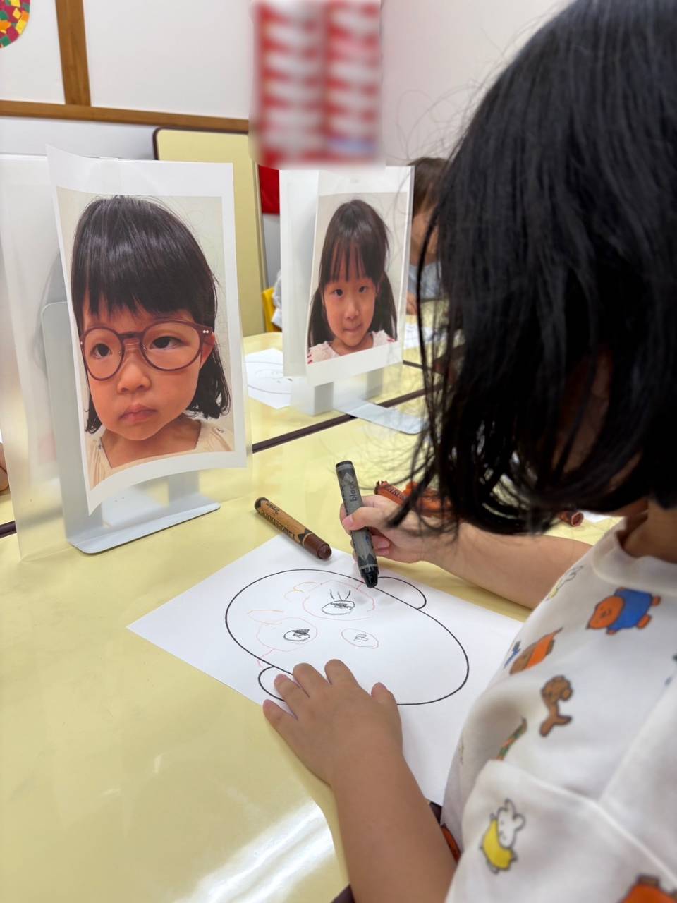 今月は顔のパーツについて学習をしているみんな。単語だけでなく、実際に自分たちの顔をさらに知ってもらおうと自画像に挑戦してみましたよ☆今回はその時の様子をご紹介します♪