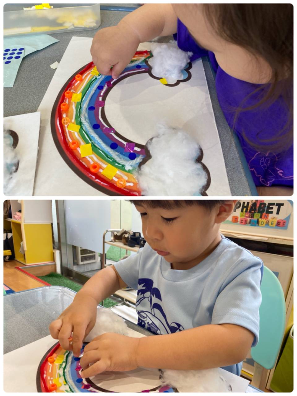 ということで、今回Small Kidsは色のお勉強も兼ねて、色々な素材を使って色をマッチさせながら、一人ずつレインボーを作ってみました!その様子をお届けします♪