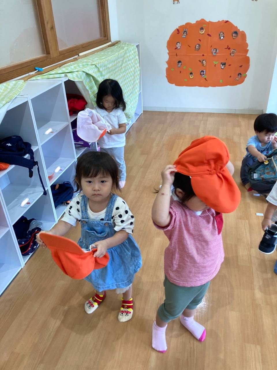 「Let's get your orange hat~!」と先生が言うと、みんな帽子と靴を取りにきます♪