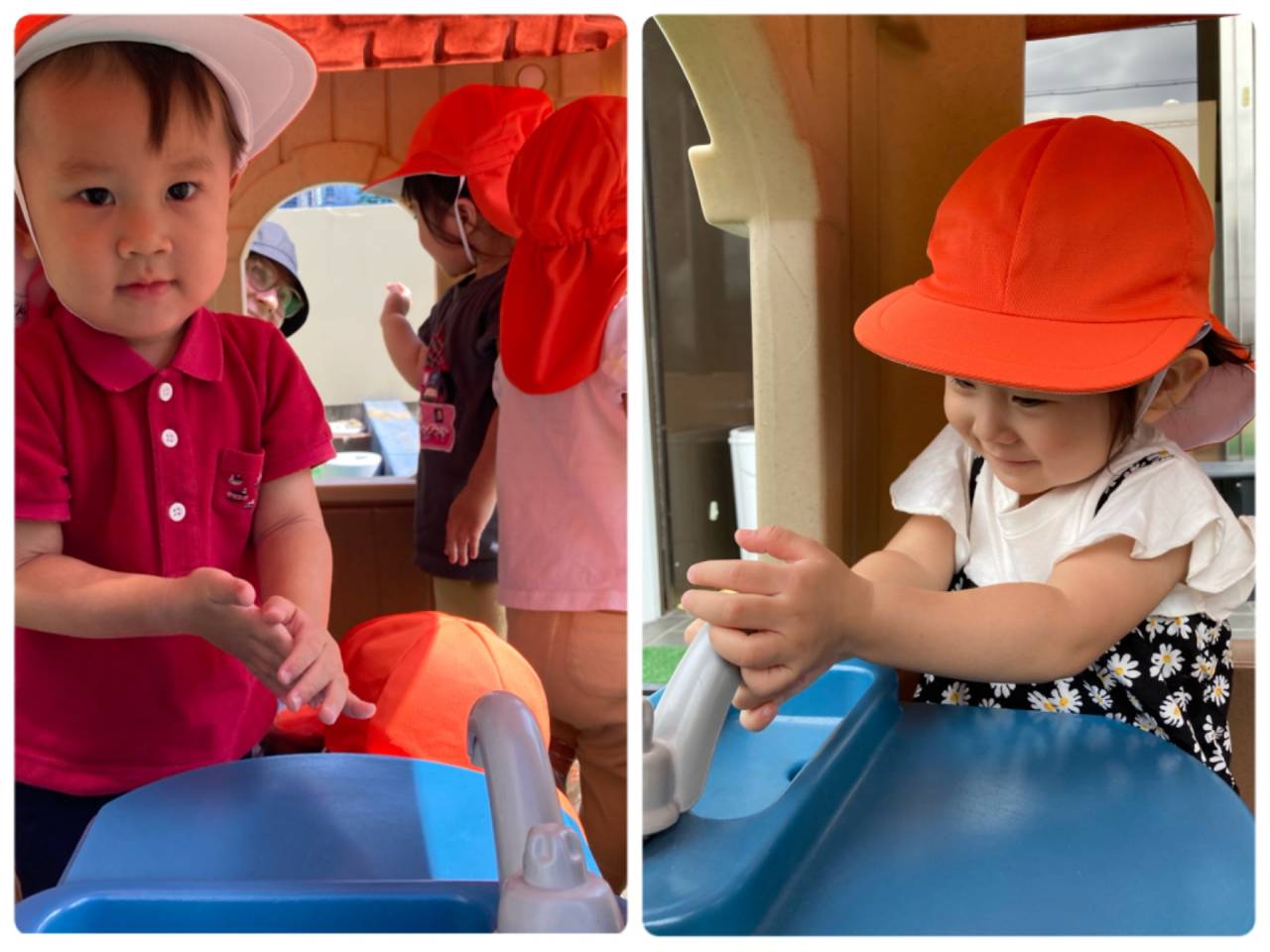 こちらはお家の水道で綺麗に手を洗っていますよ〜![]()