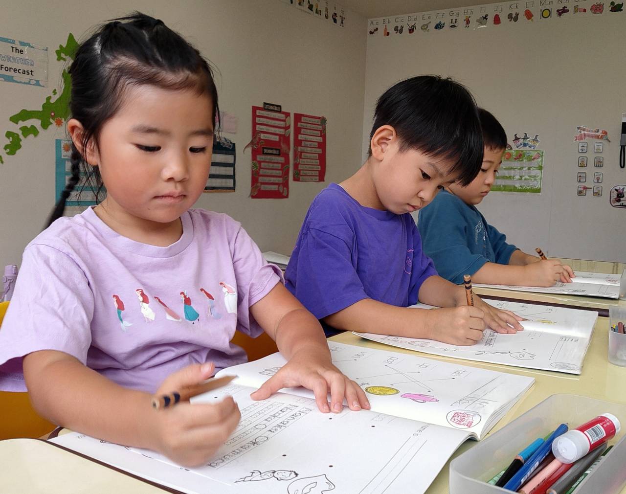 ワークタイムでは、みんな集中してABCのつづりを練習しています。