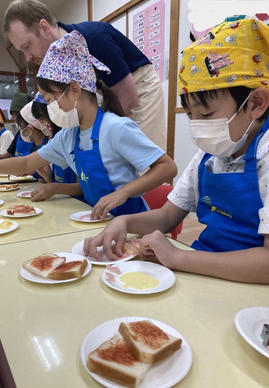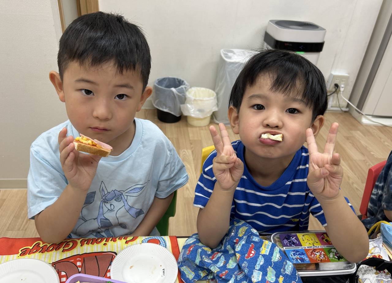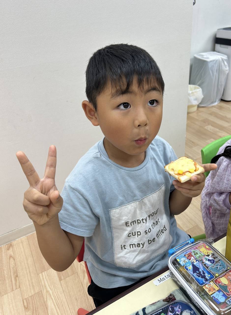 クッキングでは、ハロウィンキャラクターのクッキー型でハムやチーズをくりぬいて、ピザトーストを作りました。カラフルでかわいいハロウィンピザが完成!みんなパクパクとおいしそうに食べていましたよ。