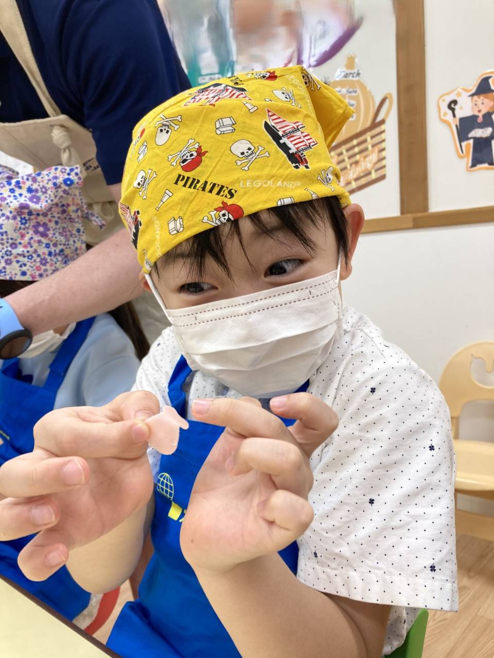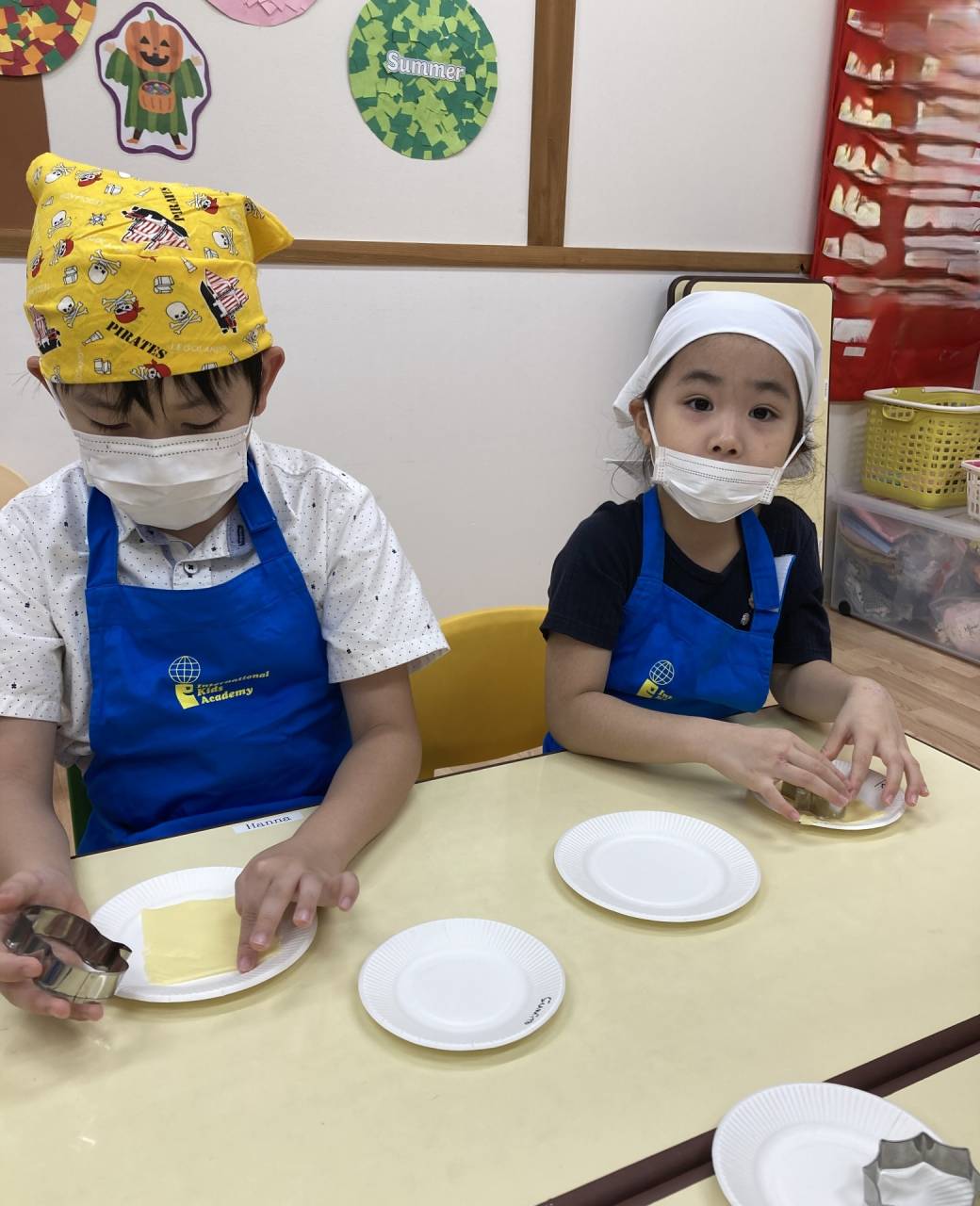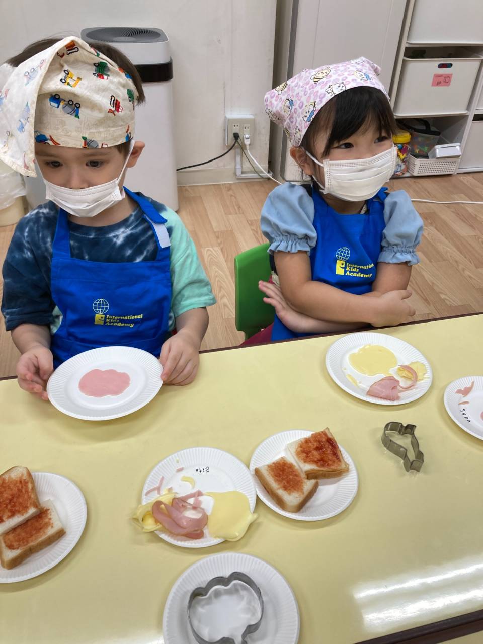 クッキングでは、ハロウィンキャラクターのクッキー型でハムやチーズをくりぬいて、ピザトーストを作りました。カラフルでかわいいハロウィンピザが完成!みんなパクパクとおいしそうに食べていましたよ。