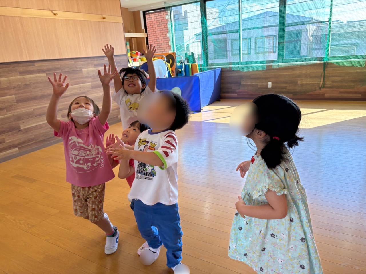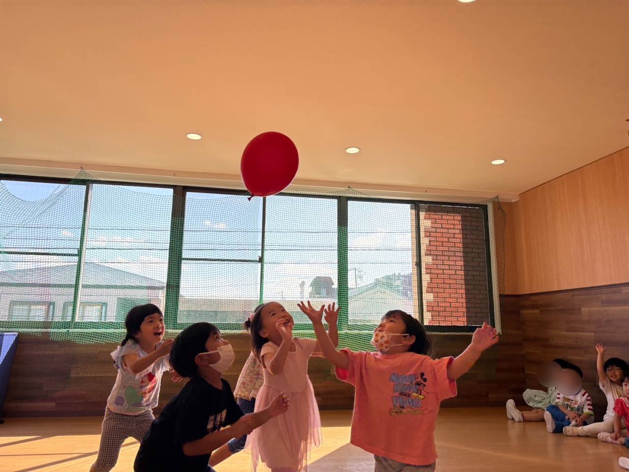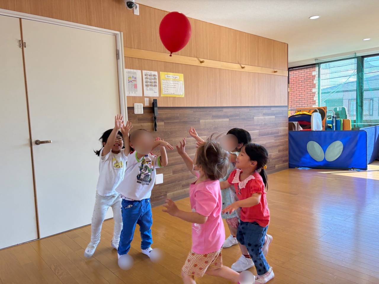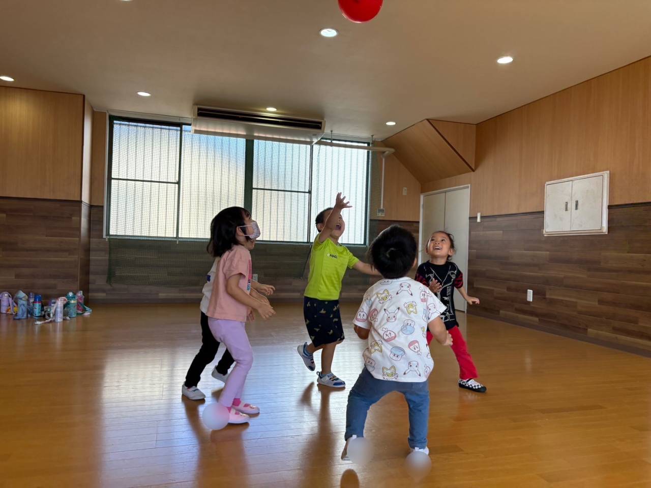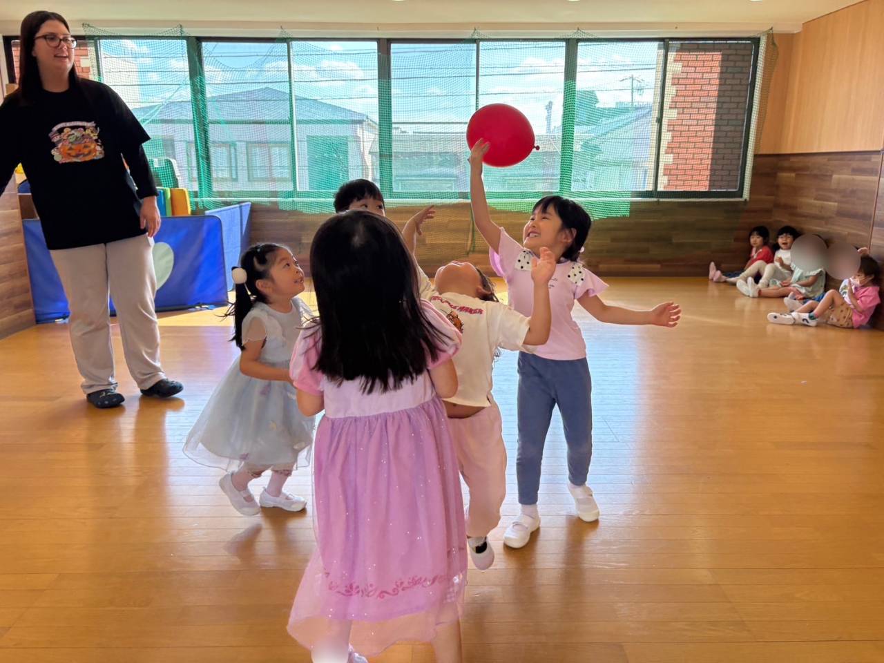 ゲームは、お友だちと協力しながら風船を床に落とさないように上に上げ続けるというもの。どのチームが長く落とさずにいられたかを競いました。今月の テーマが "Dairy Food" (乳製品)なので、そこで学習している単語からチーム名を決めてもらいました(^^)