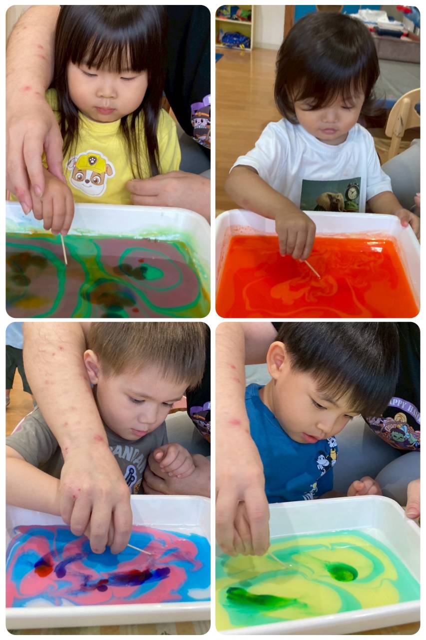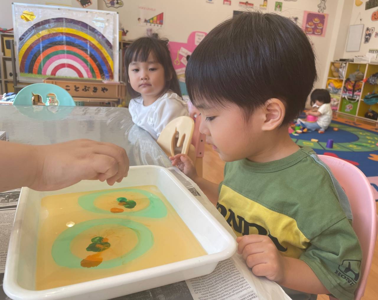 Hello, everyone! Preschool is here with another exciting craft! It starts with a tray of water and some incredibly fascinating new paint drops. What could it be?