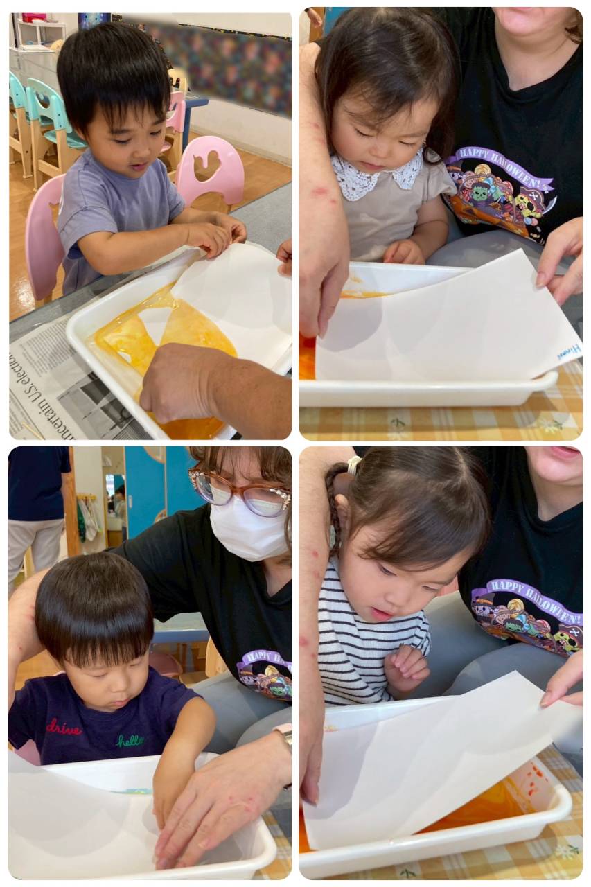Once we get our colors juuuust right, it's time to dip our paper! The motion is a dip and slide motion to get the paint directly onto the top of the paper instead of simply soaking the sheet!