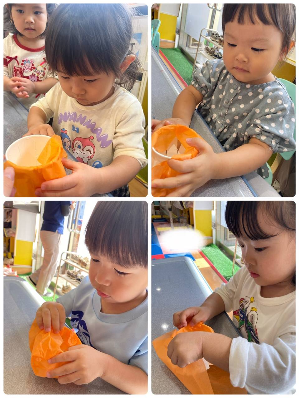 上手に綺麗な丸を作った後は、パンプキンカラーのオレンジ和紙を使って、紙コップを包んでいきます!