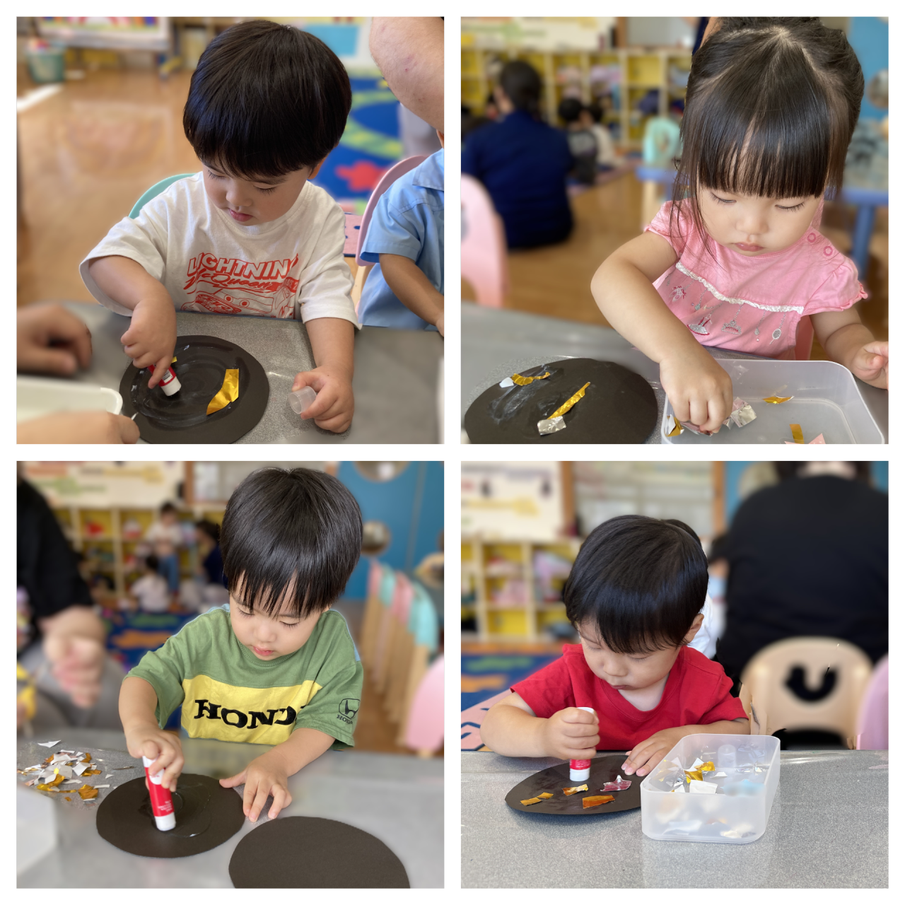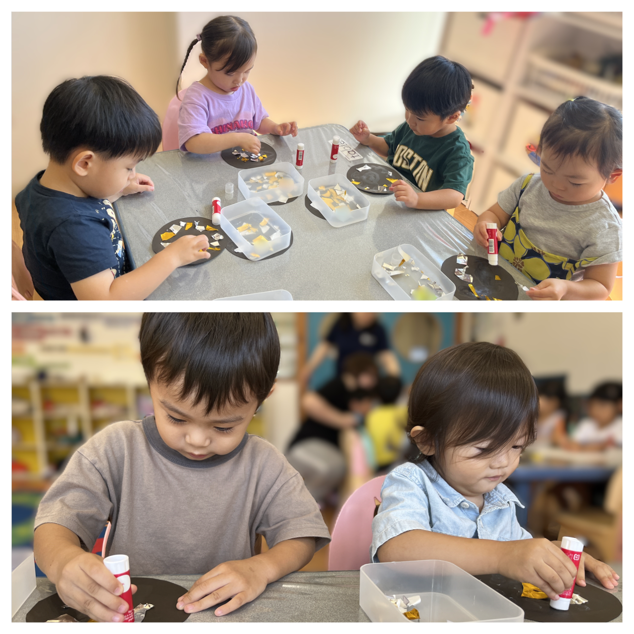 ハサミが終わったら黒い紙に切った折り紙を張り付けていきます!