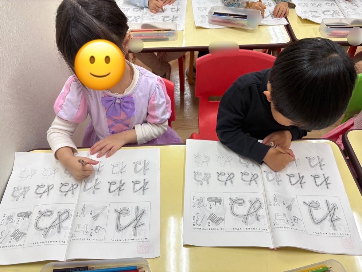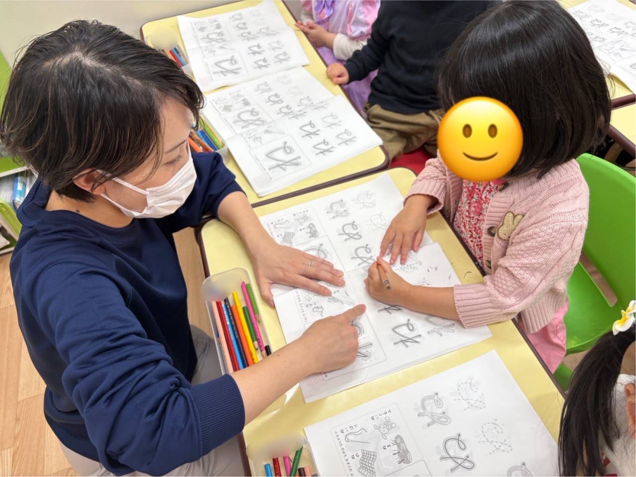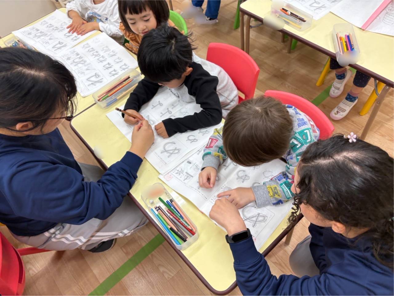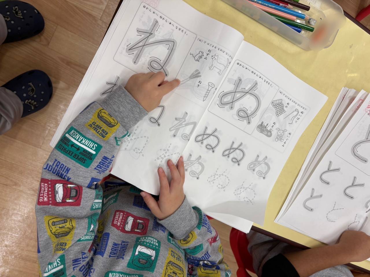 週に一度ある Japanese Lesson は日本語での会話が許される時間のため、みんなにとっては大好きな時間の一つのようです♪そんな Japanese Lesson ではひらがなの学習も進めています。その日に練習する文字を使った言葉なども一緒にみんなで確認します!お友だちの名前に入っている文字は「〇〇ちゃんの〇!」といった感じで紹介すると、本人は照れた表情で嬉しそうにしていてとってもかわいいです♡(笑)