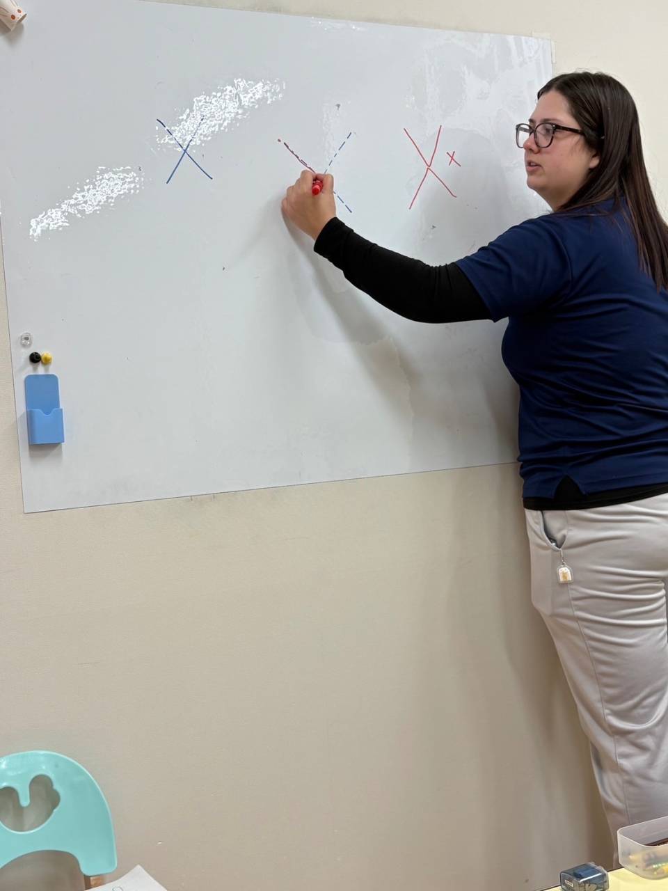 Language Artsのレッスンでは、アルファベットを書く練習も頑張って進めています。ひらがなの時と同様に、まずは先生が書き方のポイントを伝えていきます。