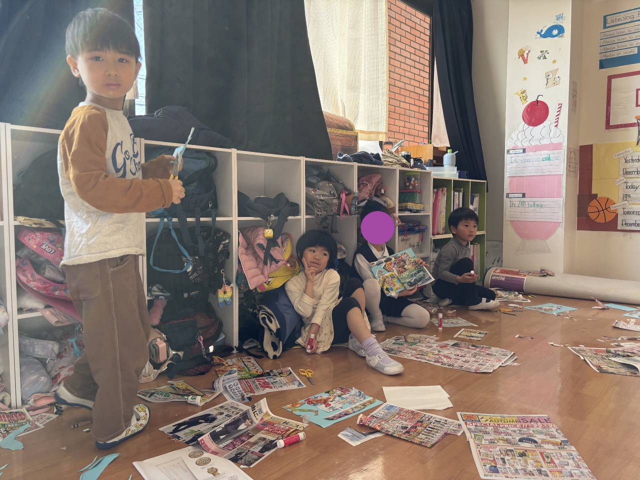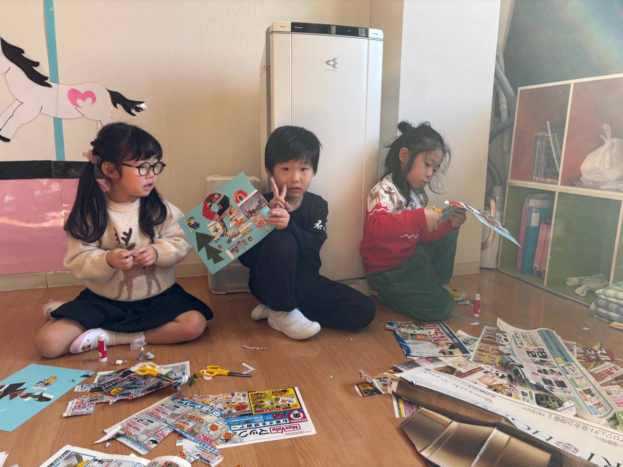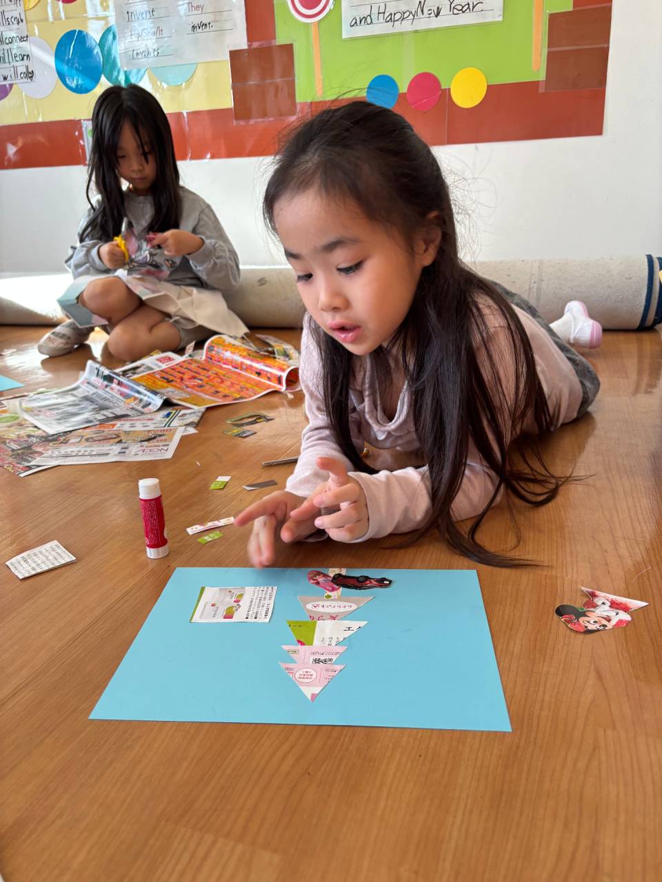 In the morning, we enjoyed making Christmas collages together with cut-up magazines and newspapers. We cut out different shapes from the colored paper to make our own unique Christmas-themed pictures, such as presents or a Christmas tree. We practiced cutting and using scissors while also using our imaginations and having a fun time with our friends.
