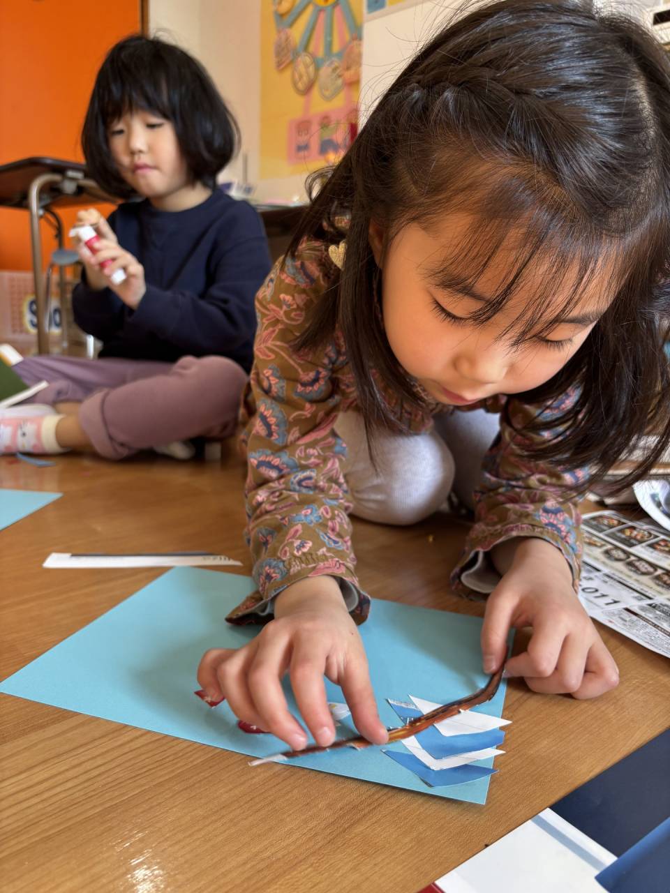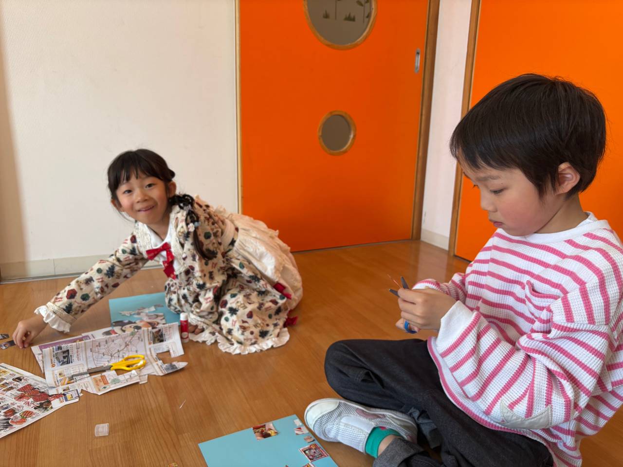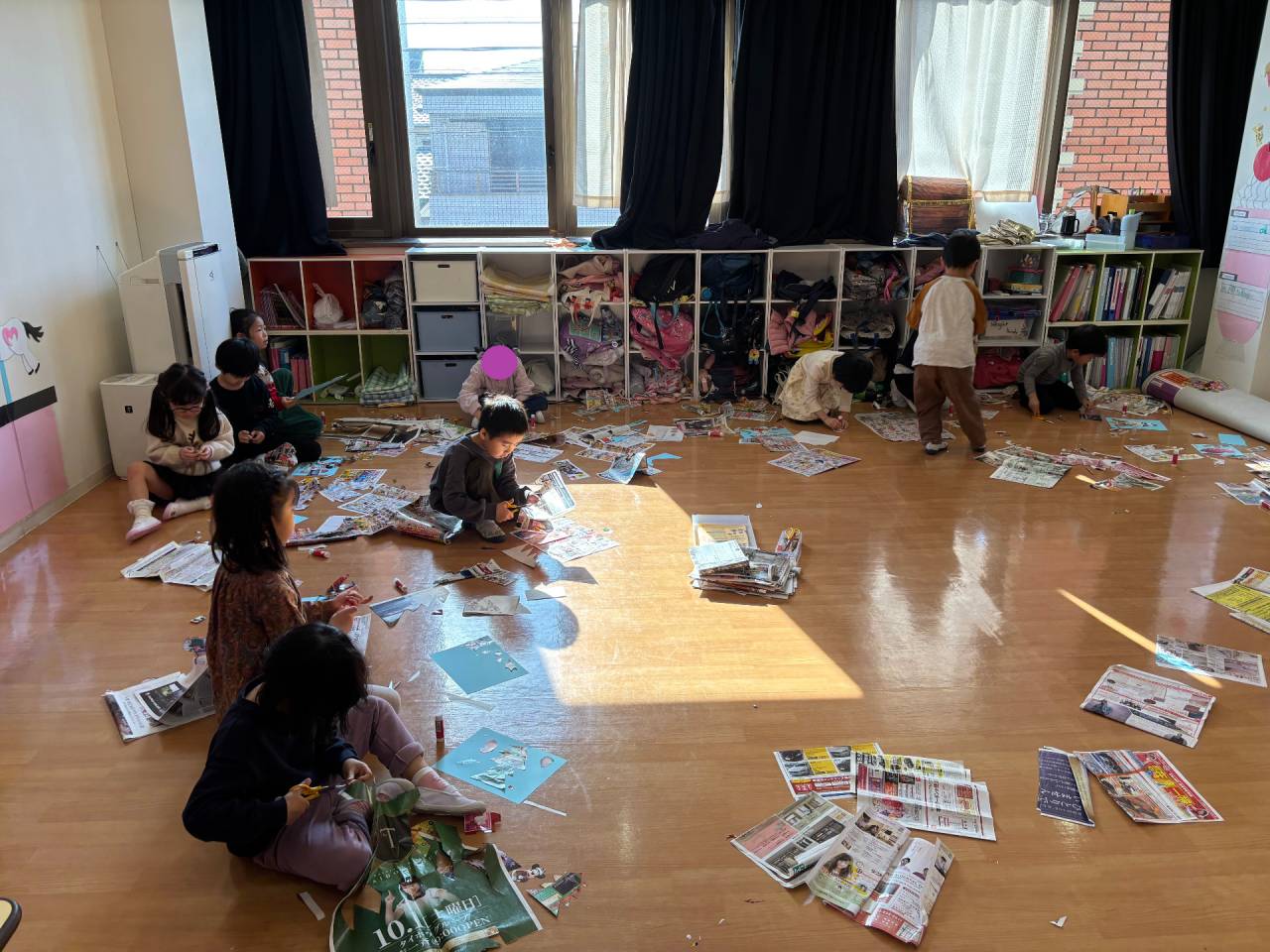 In the morning, we enjoyed making Christmas collages together with cut-up magazines and newspapers. We cut out different shapes from the colored paper to make our own unique Christmas-themed pictures, such as presents or a Christmas tree. We practiced cutting and using scissors while also using our imaginations and having a fun time with our friends.