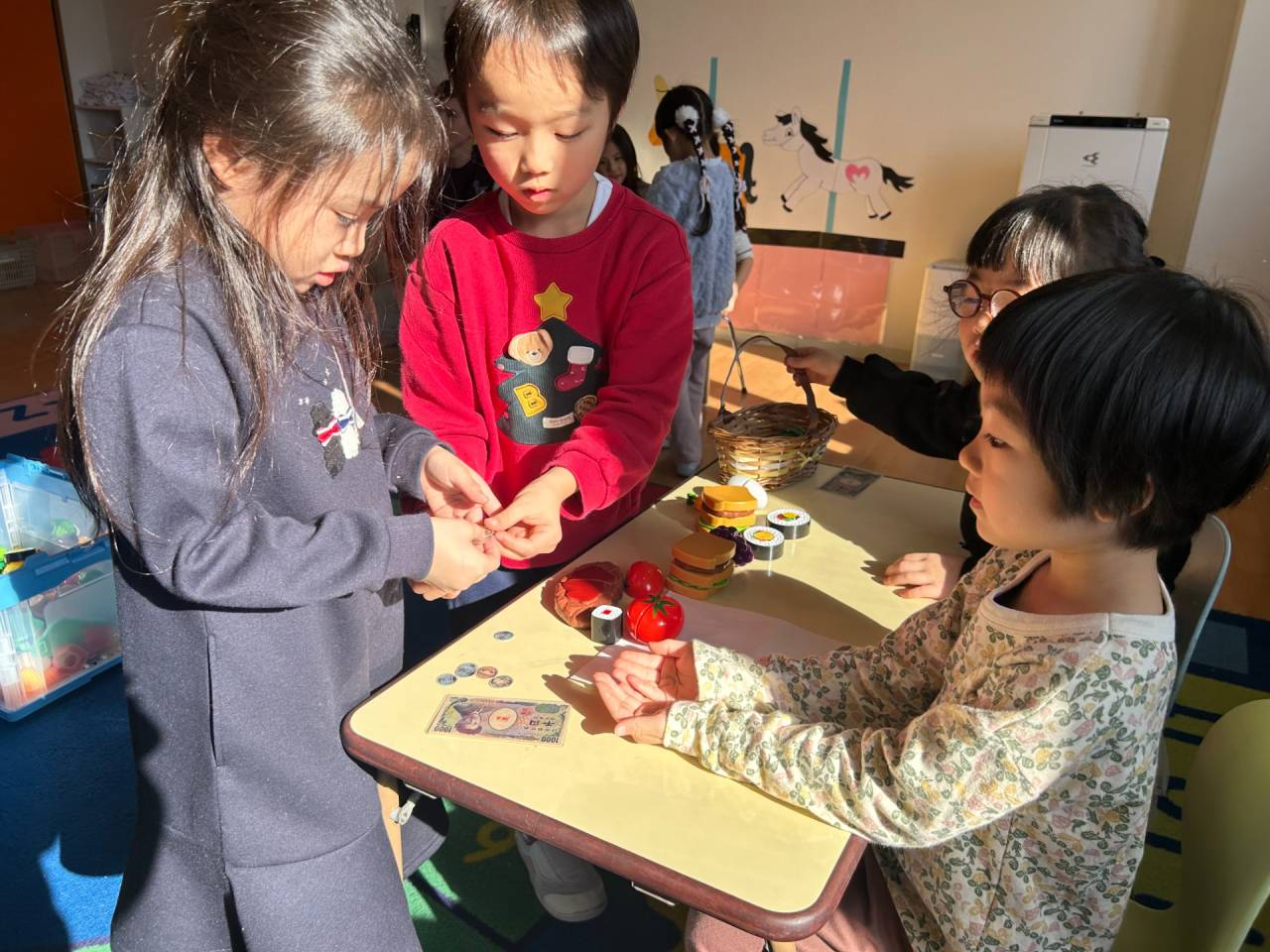 子どもたちがお店屋さんやお客さんになって、商品を選び、値段を聞いたりしながら、お金の支払い方を体験しました!