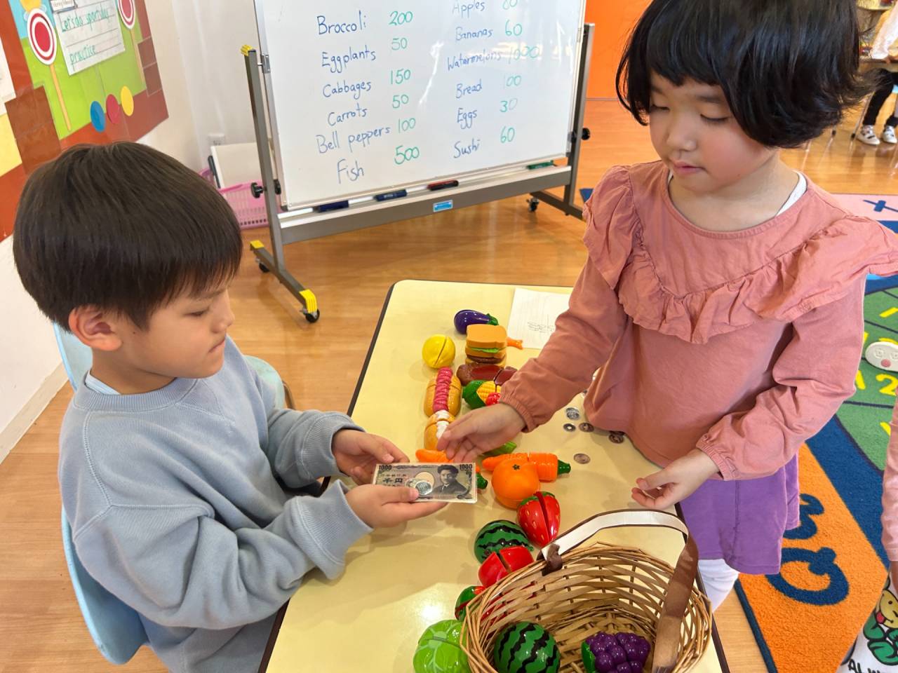 ショッピングで使うフレーズを練習しながら、合計がいくらになるのか計算し、忙しいお店屋さん。