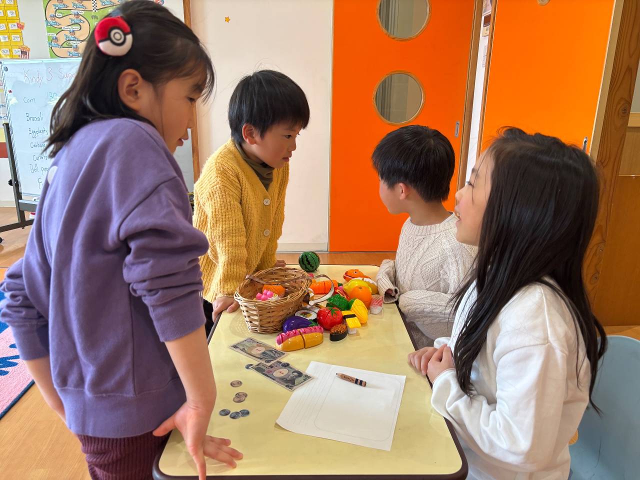 数の概念を理解するために、今日はショッピングのロールプレイングをしながらお買い物の練習をしました。