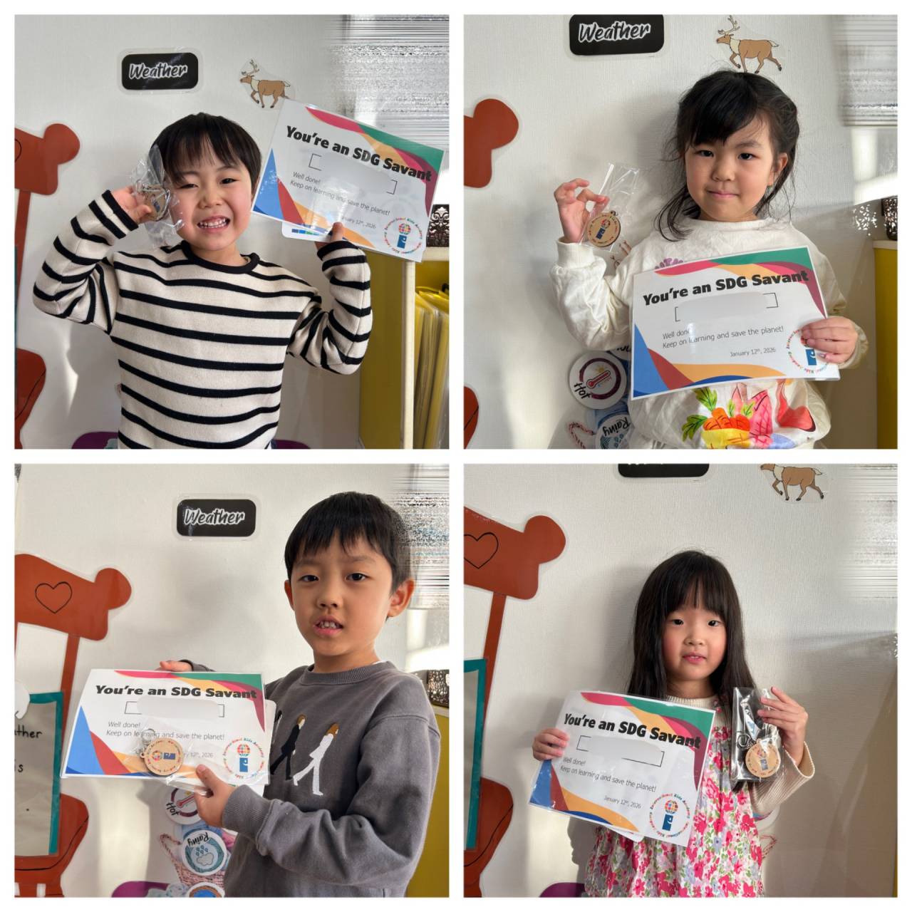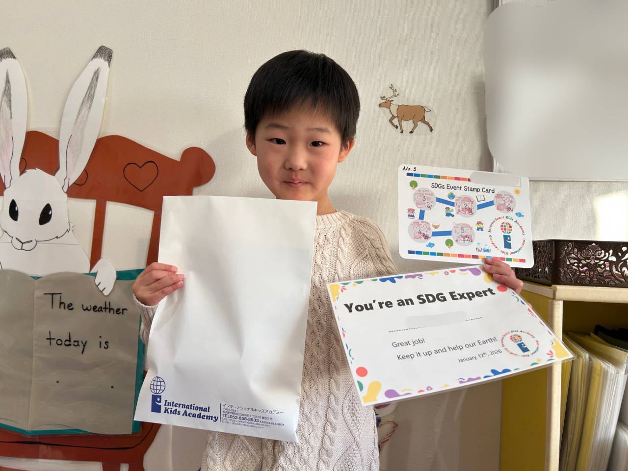 そして、今回のSDGsイベントで、スタンプカードが5個たまったお友だちと、15個たまったお友だちが増えました!Thank you♡ 賞状とprizeをもらいました!
