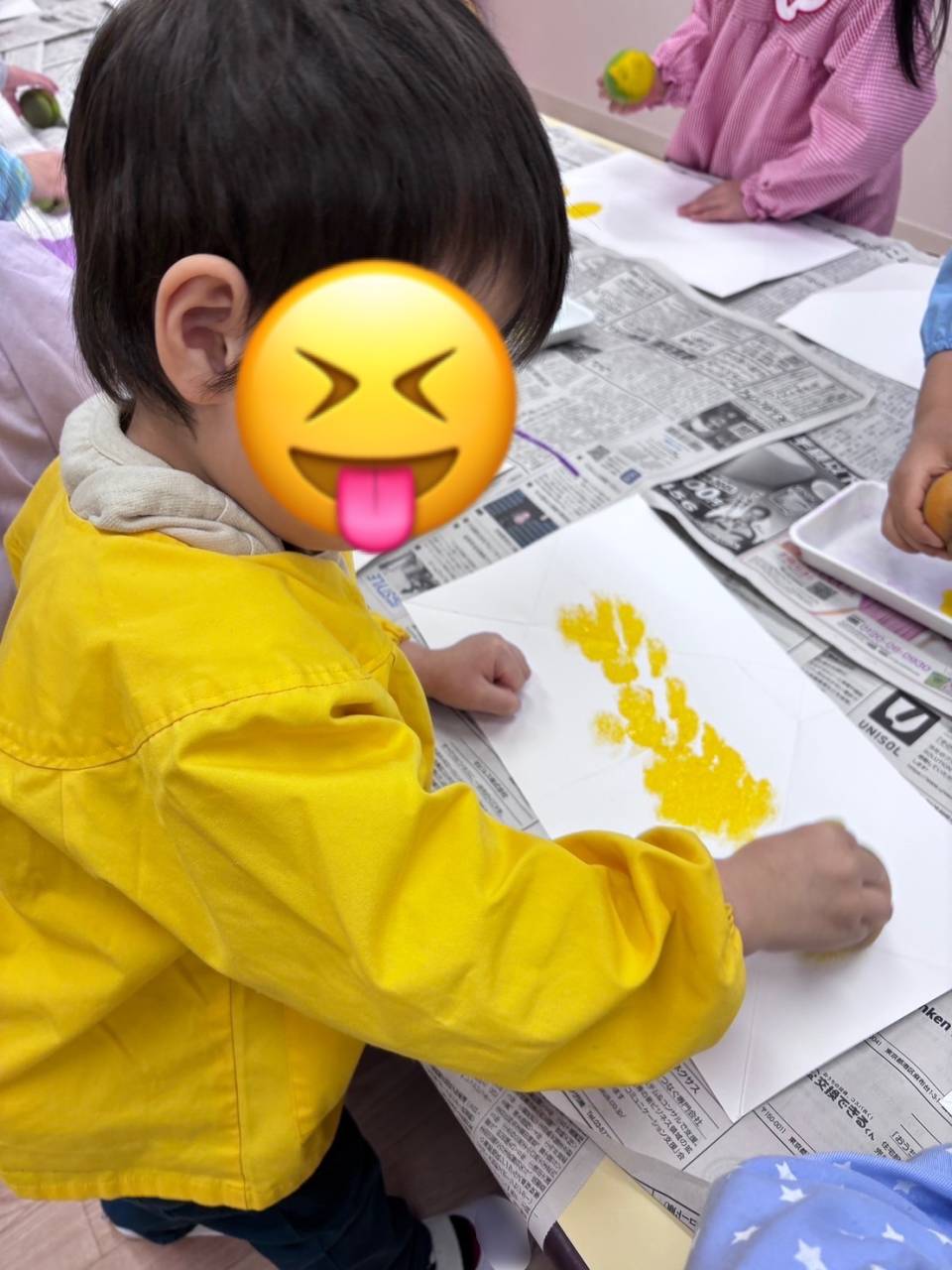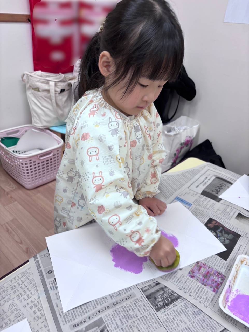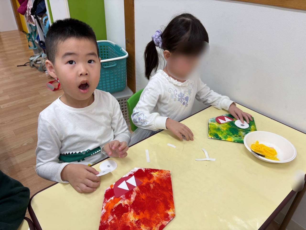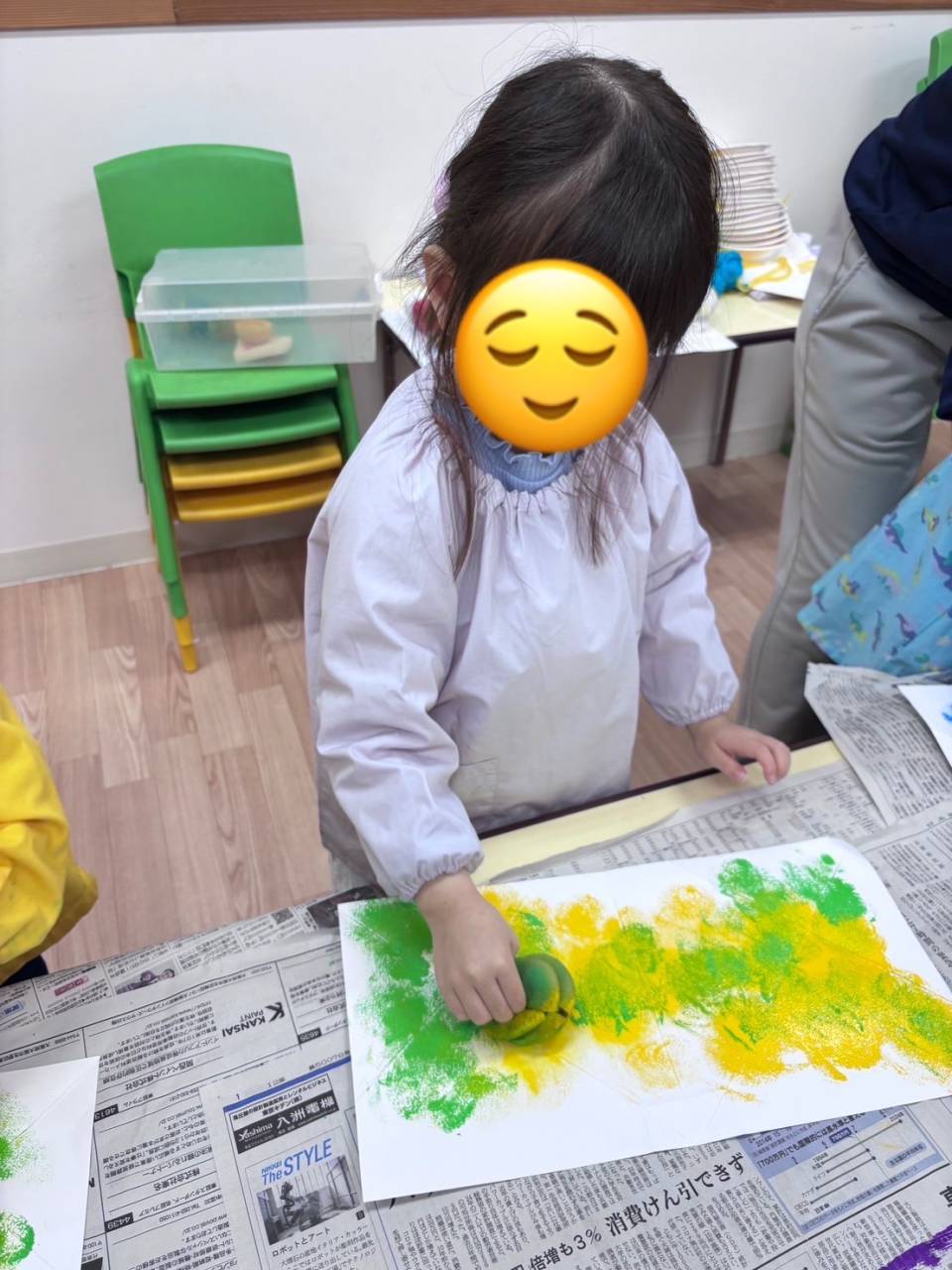 Kindy 1では赤オニ、青オニ、緑オニの3種類を作ることにしたので、3つのグループに分かれてそれぞれ白い画用紙に色を付けるところから始めました!