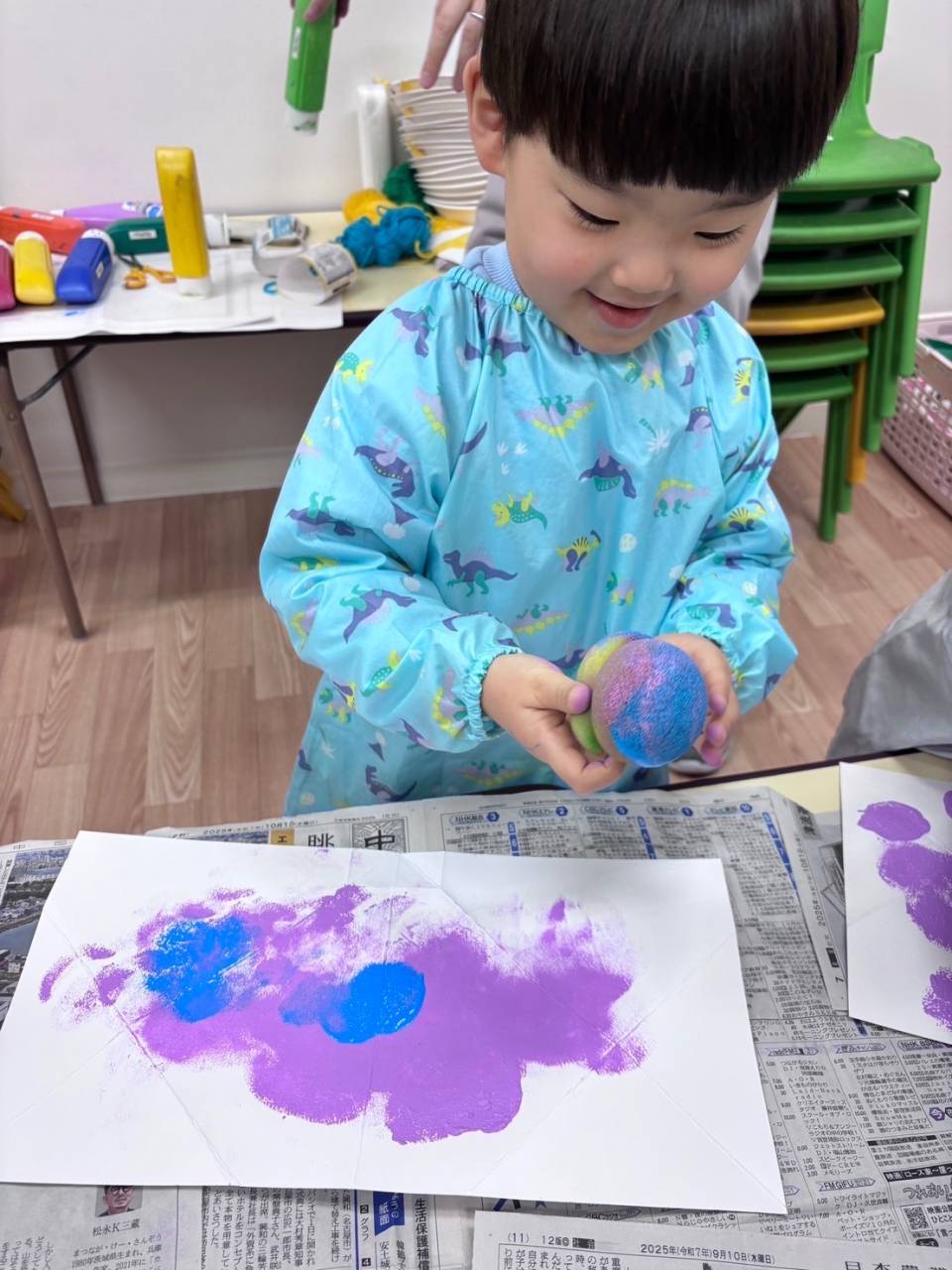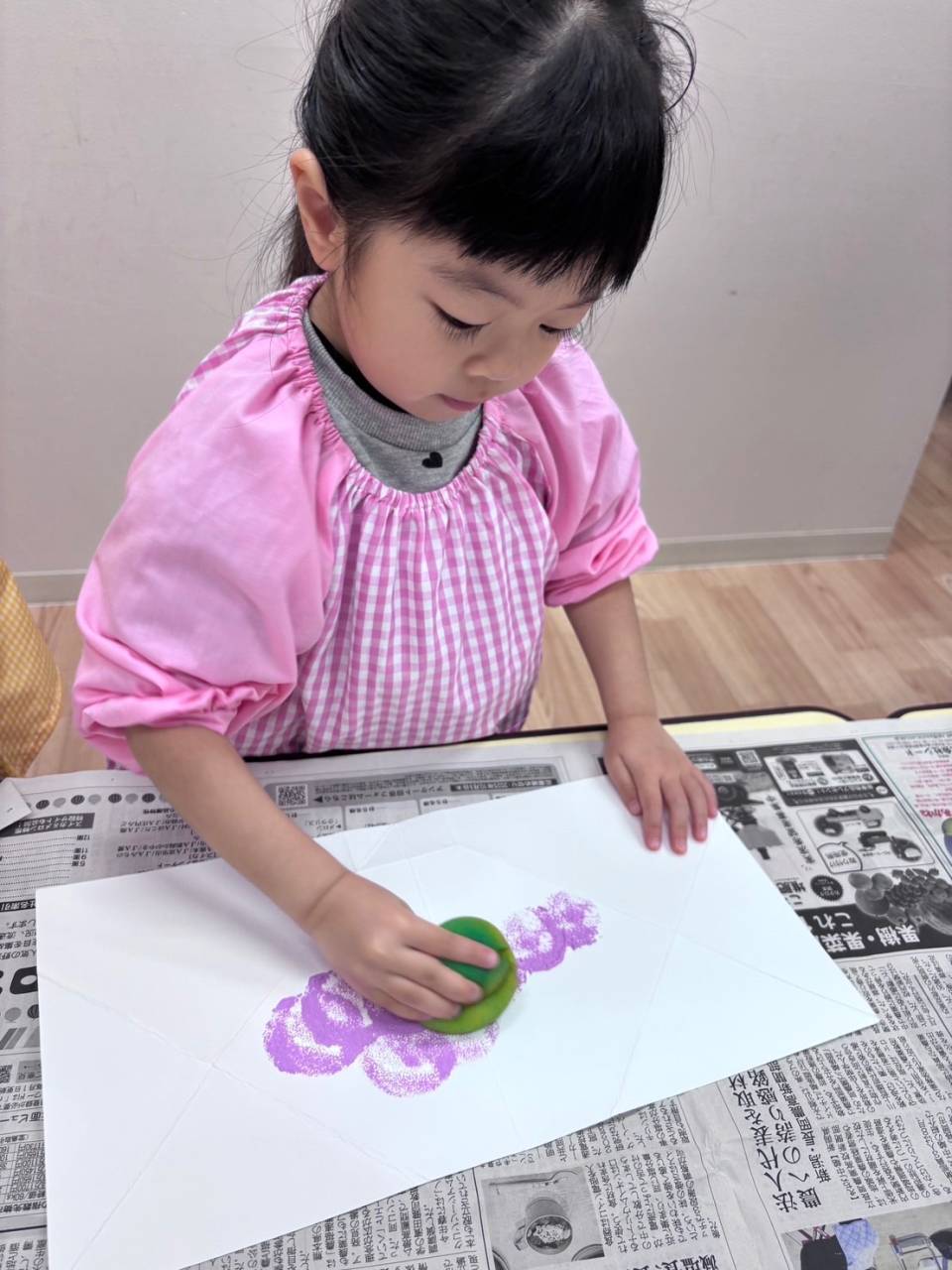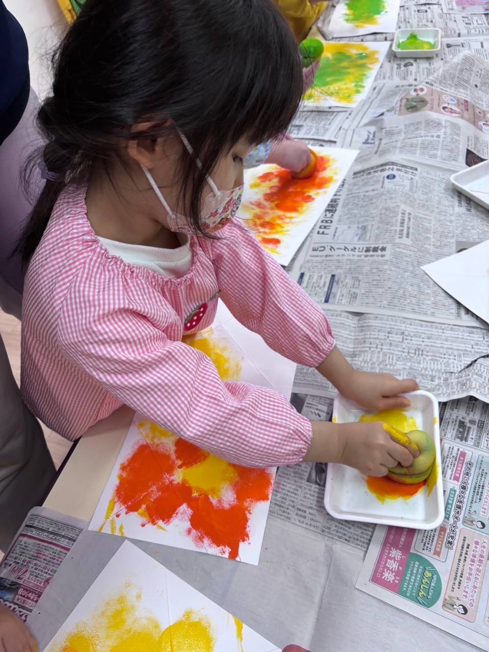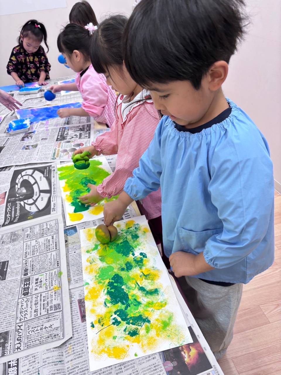 Kindy 1では赤オニ、青オニ、緑オニの3種類を作ることにしたので、3つのグループに分かれてそれぞれ白い画用紙に色を付けるところから始めました!
