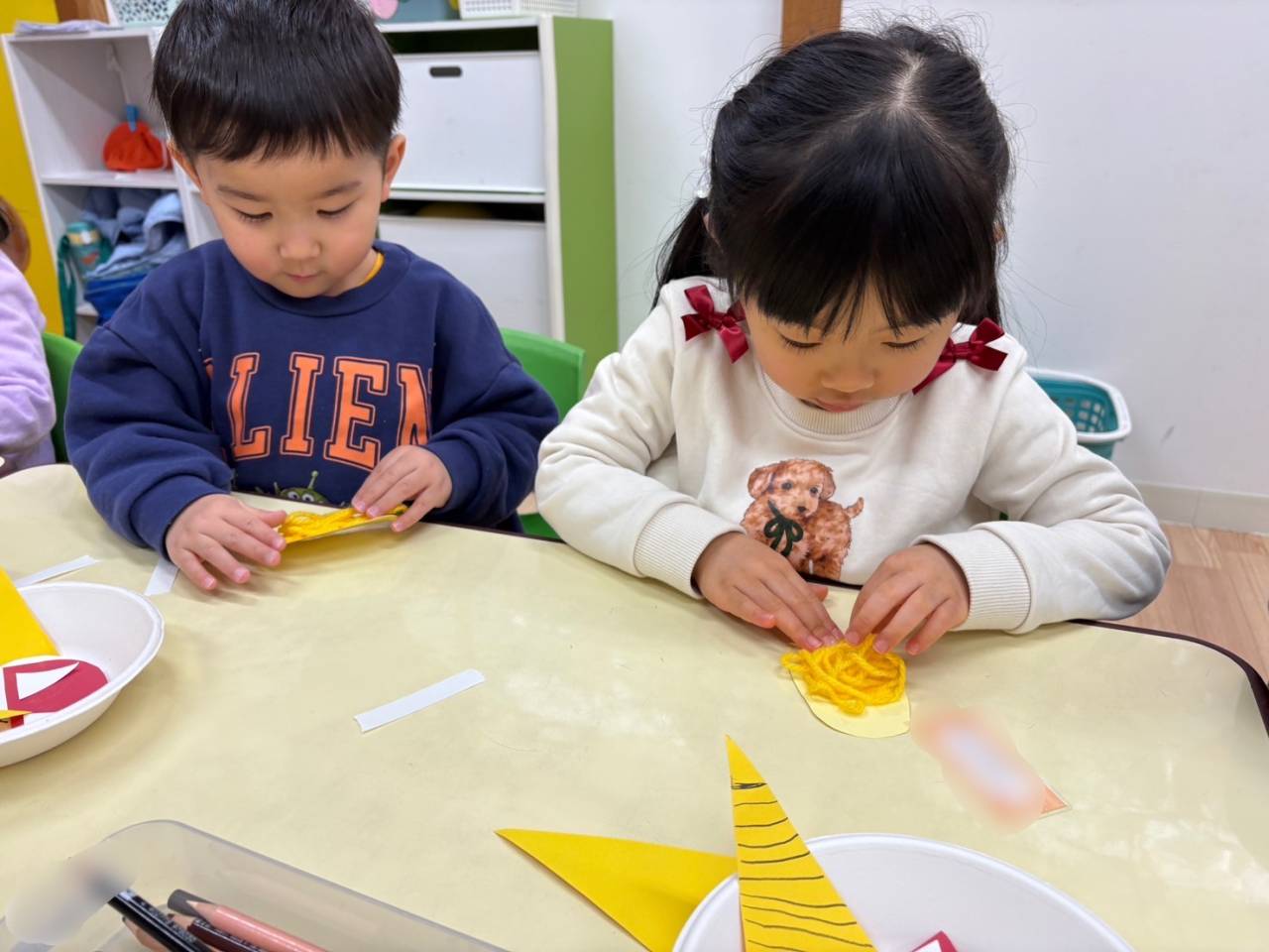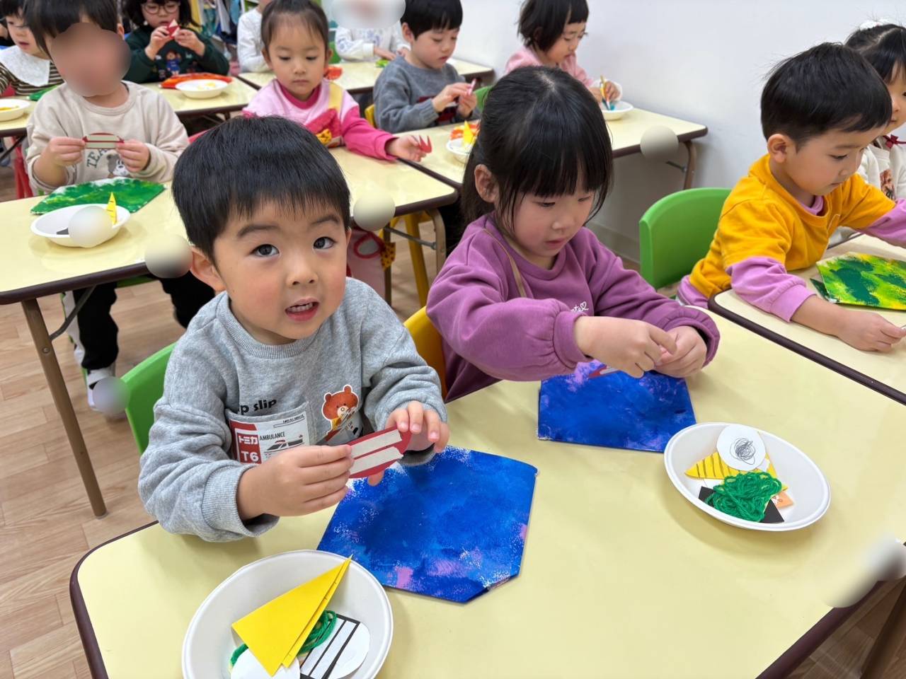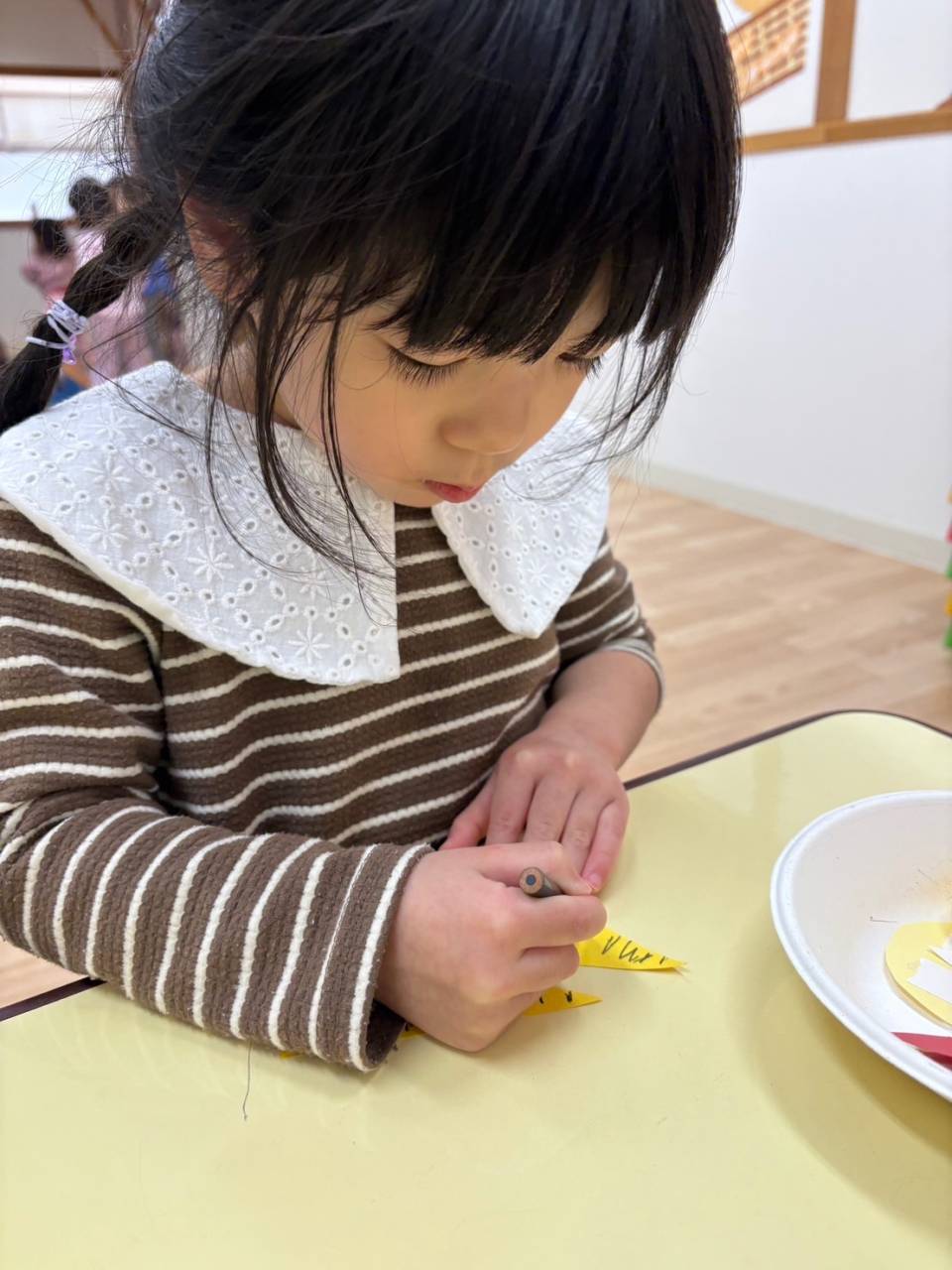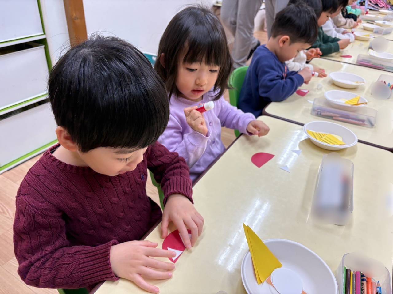 帽子の形に折られた紙にパーツを貼り付けていきます。間違えないように先生のお話をしっかりと聞いてね☆