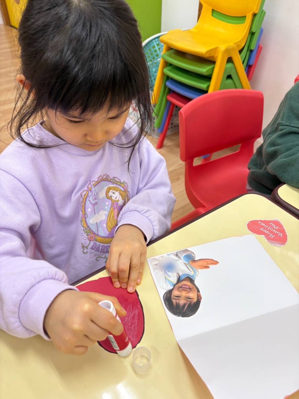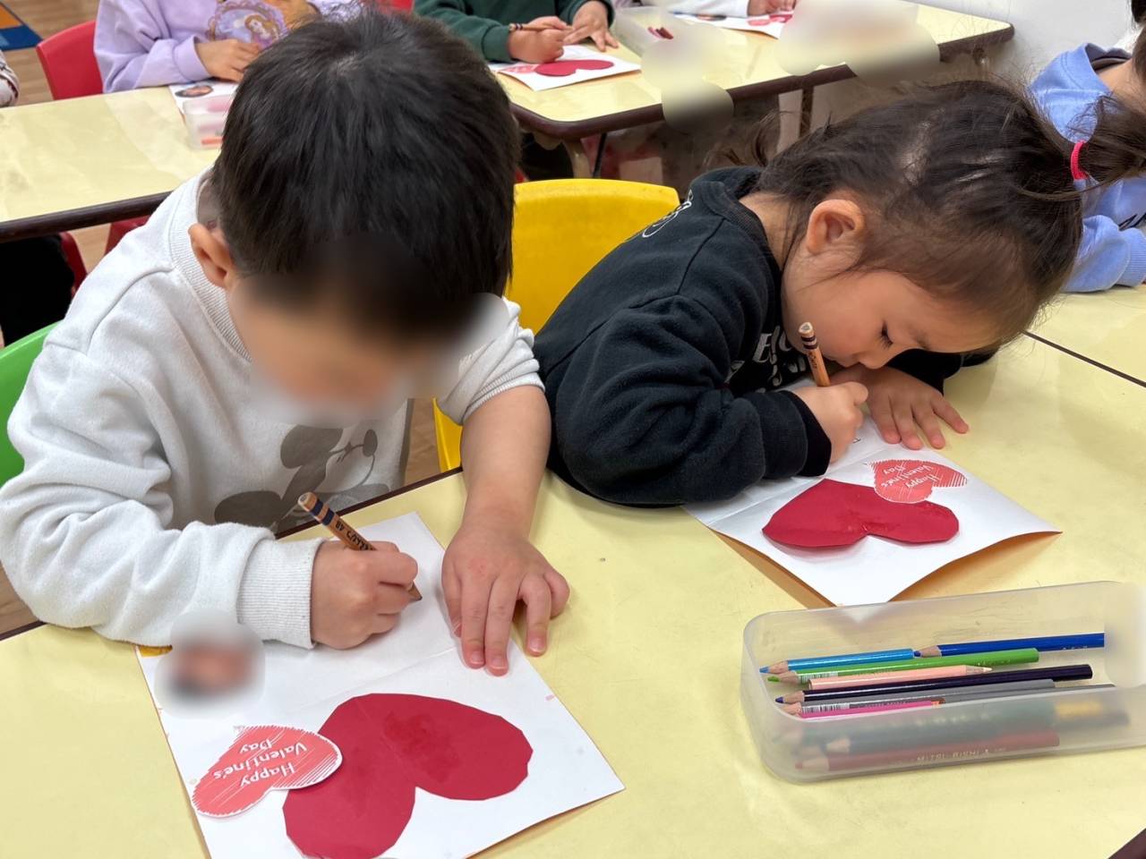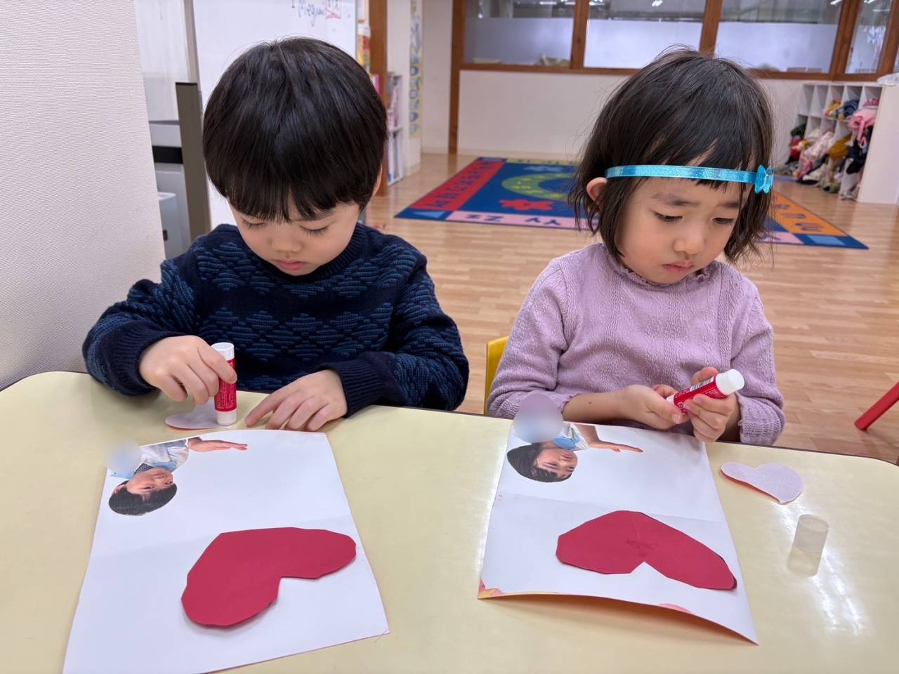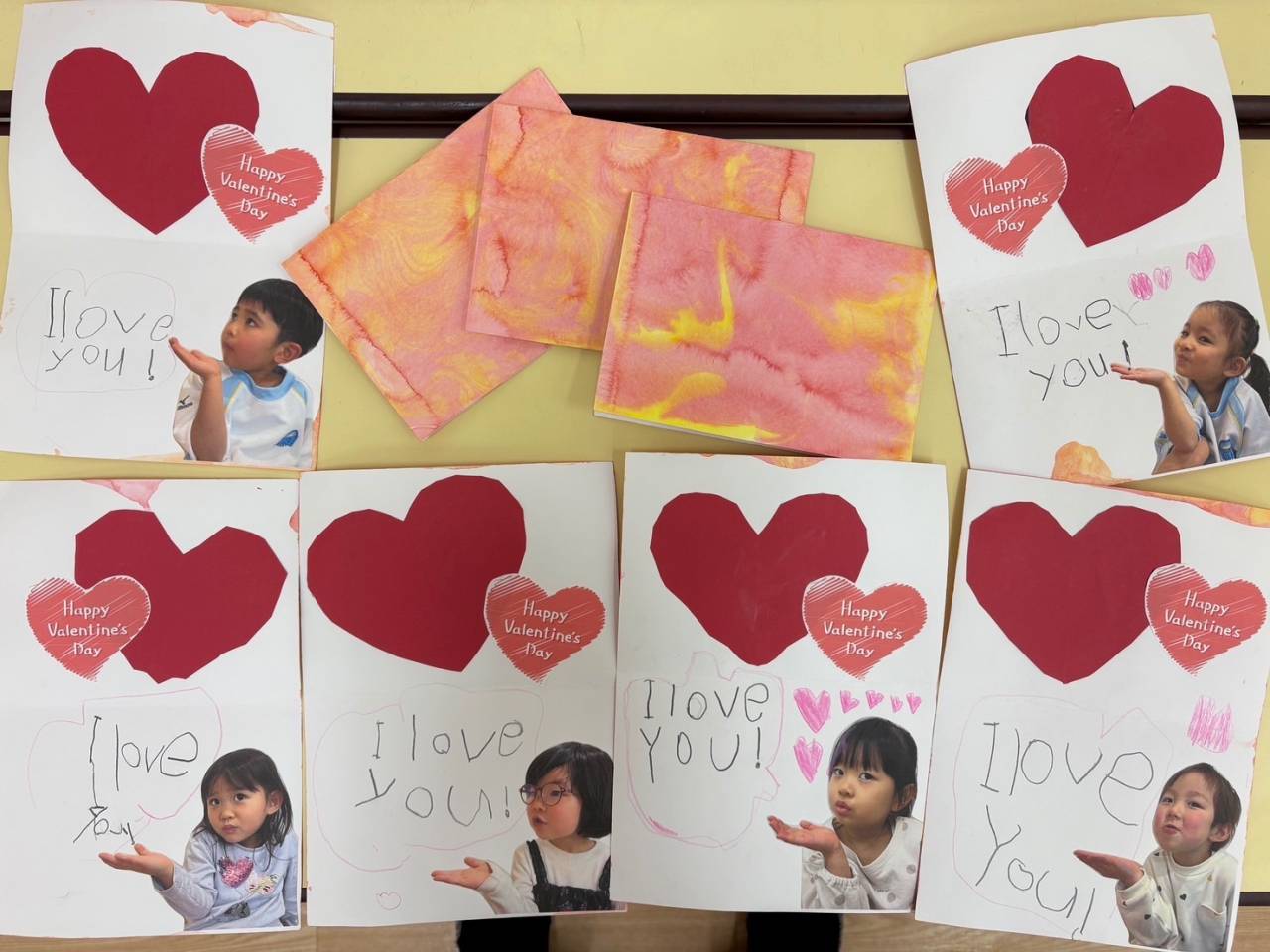 かわいらしいバレンタインカードの完成です♡お手本を見ながらアルファベットがしっかりと書けるようになったのもこの1年でのかなりの成長ですね(^^)
