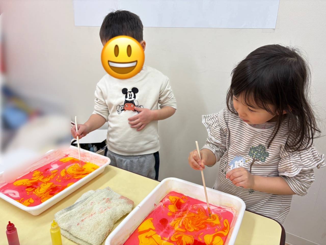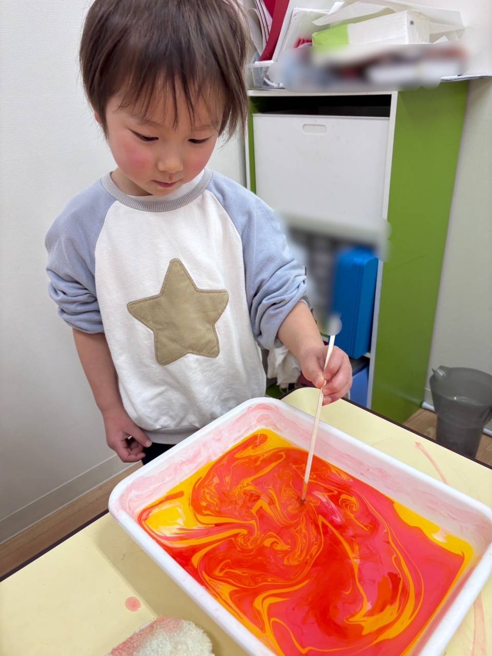 専用の絵の具を水に垂らしてそっとまぜまぜ…みんなそれぞれきれいな模様を作ることができました♡