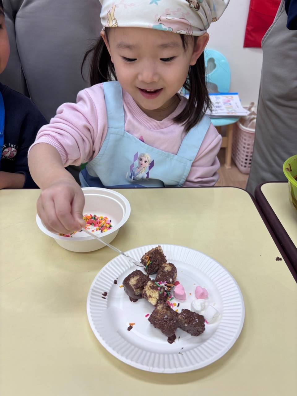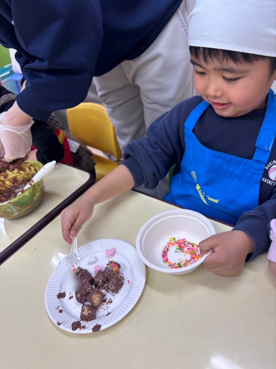 サイコロ状に切ったカステラにチョコレートを絡めて、みんなにカラースプレーやハート型のマシュマロでデコレーションをしてもらいました(^^)