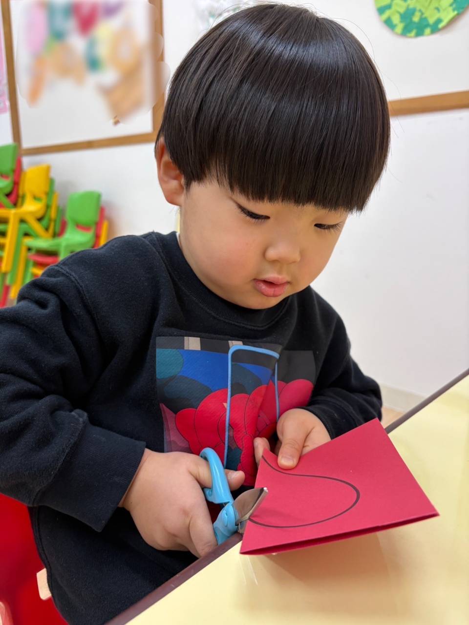 次に、半分に折られた赤色の画用紙を線に沿って切ります。何ができるのかな?