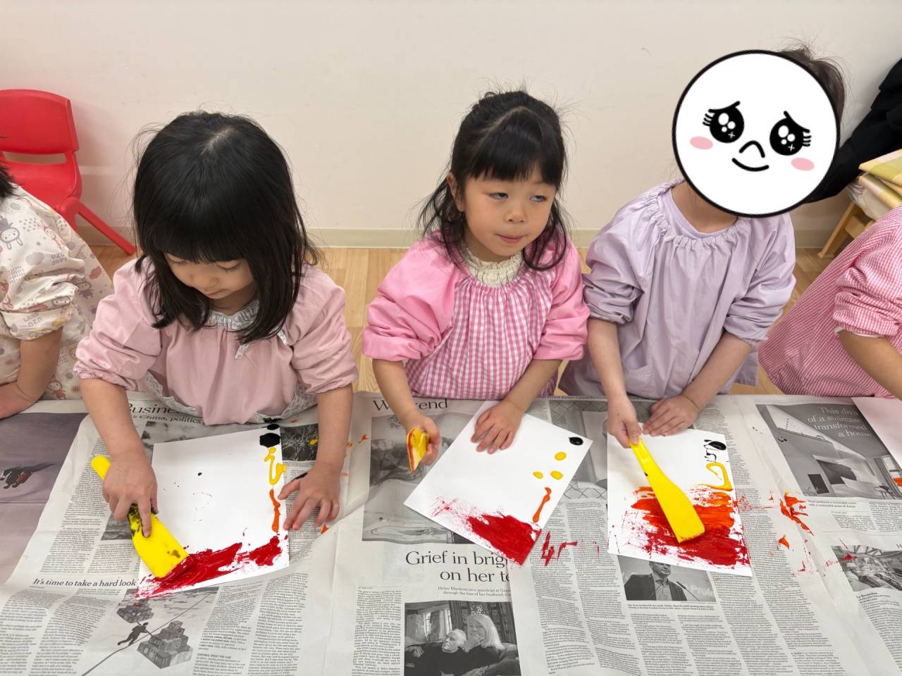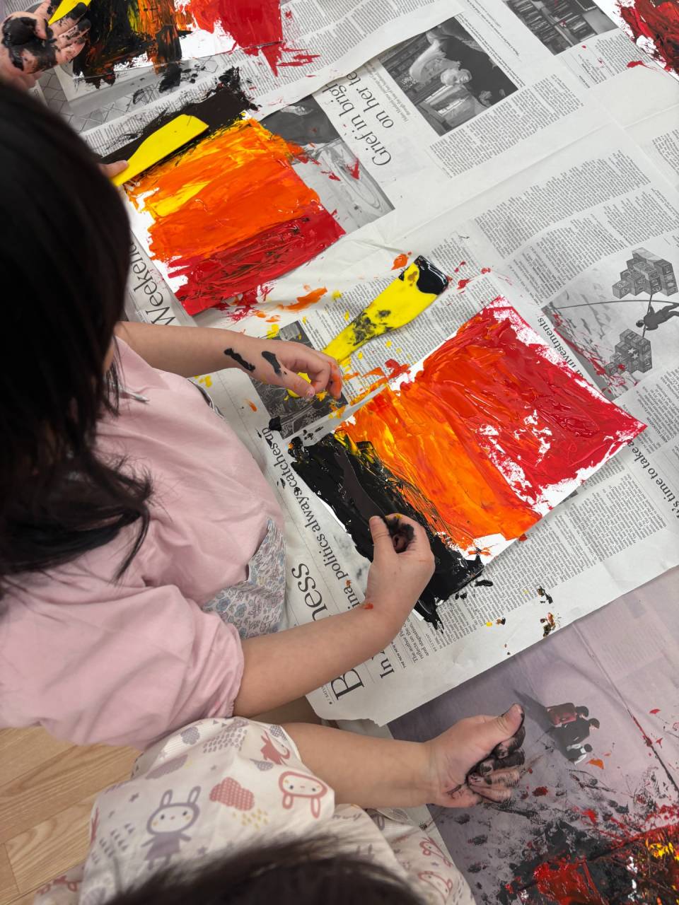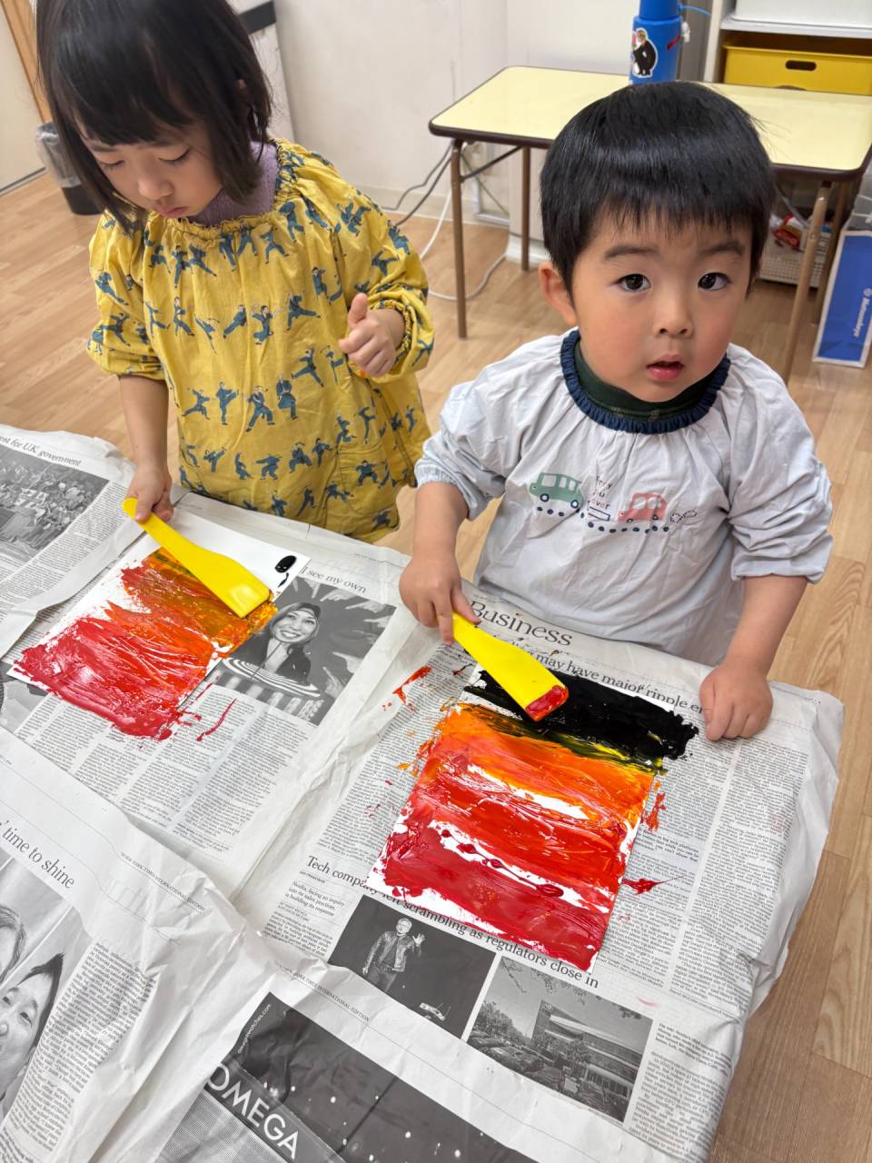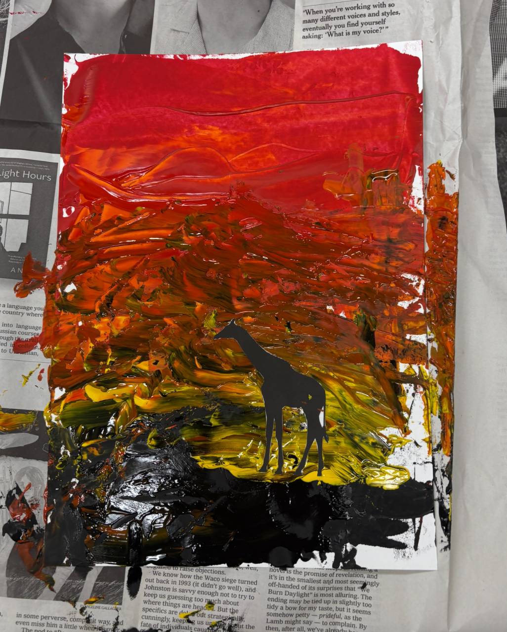 Once we were ready, Megumi showed us how to paint the sunset using a scraper tool to drag the paint from left to right!