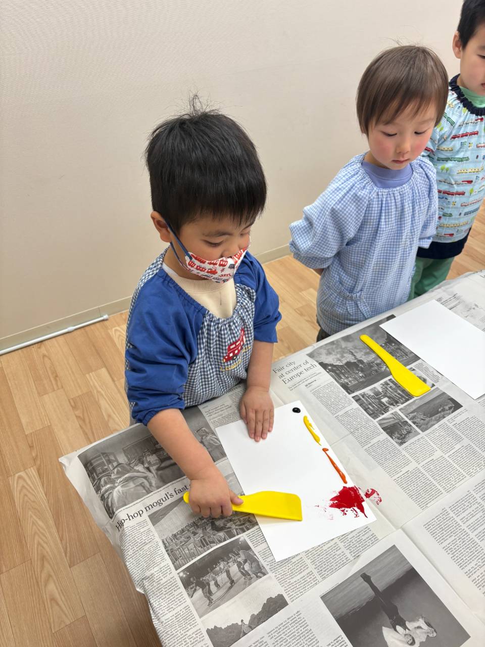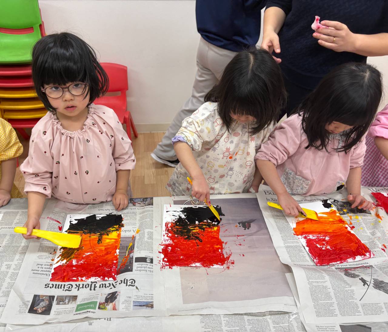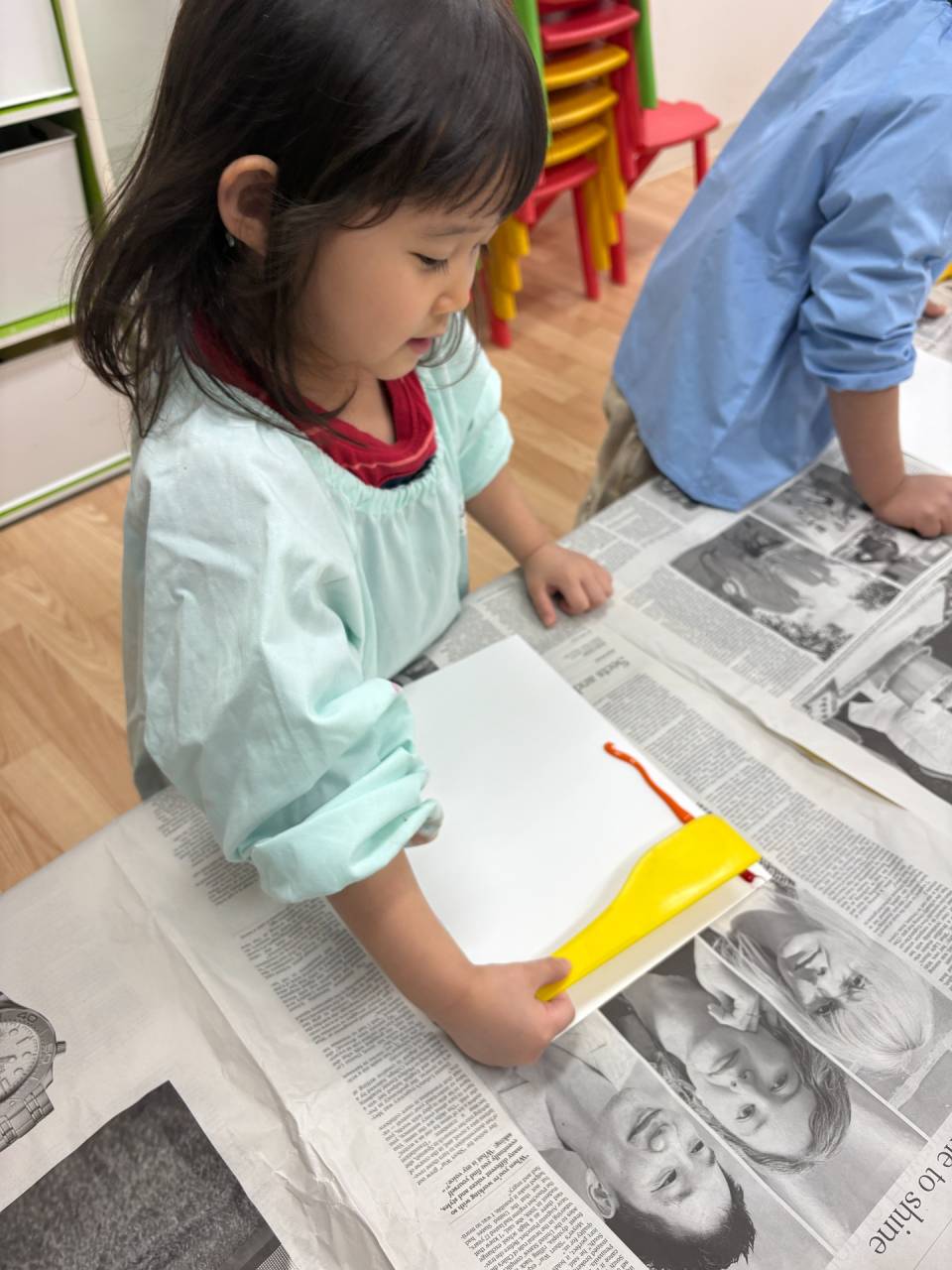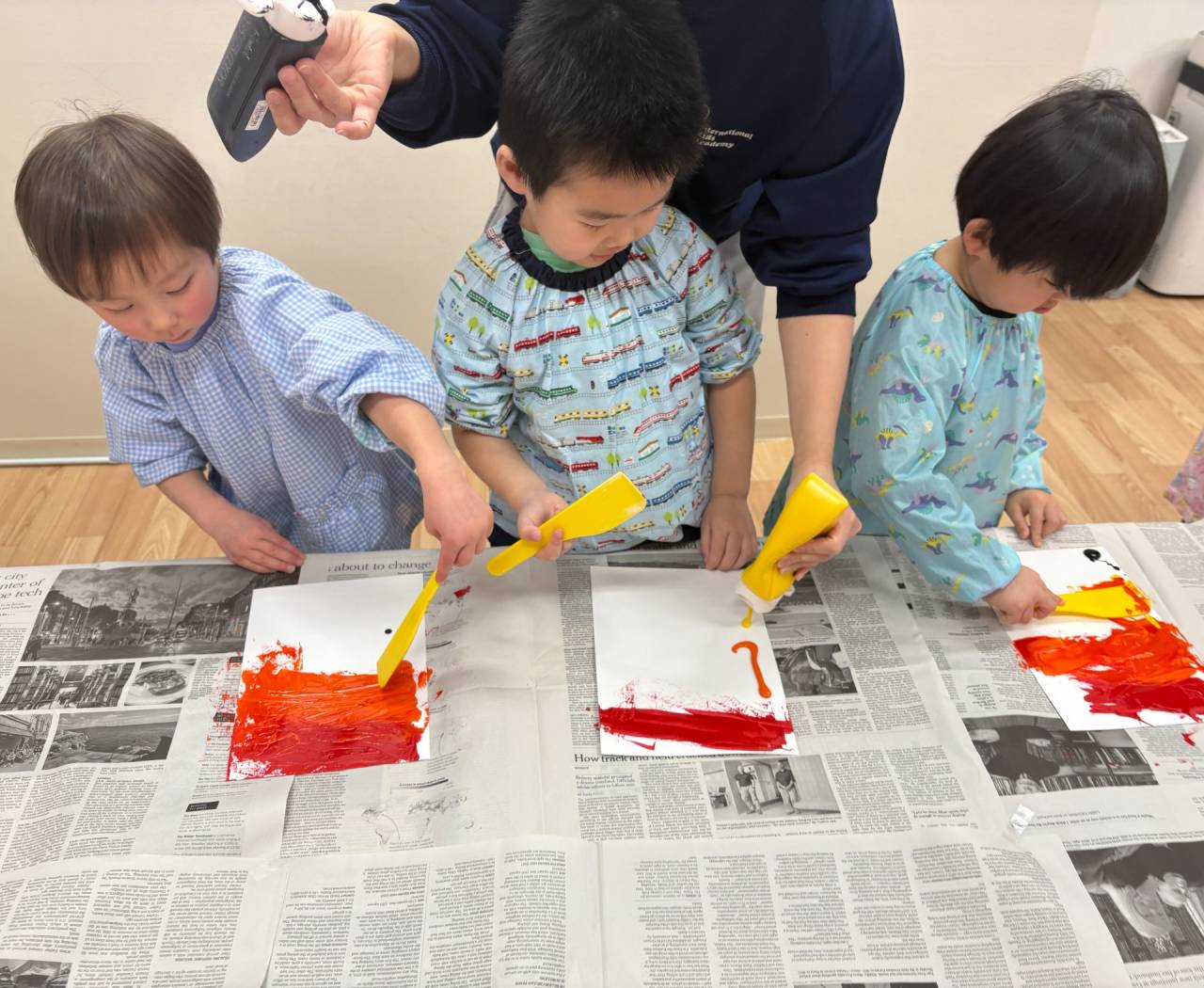 Once we were ready, Megumi showed us how to paint the sunset using a scraper tool to drag the paint from left to right!