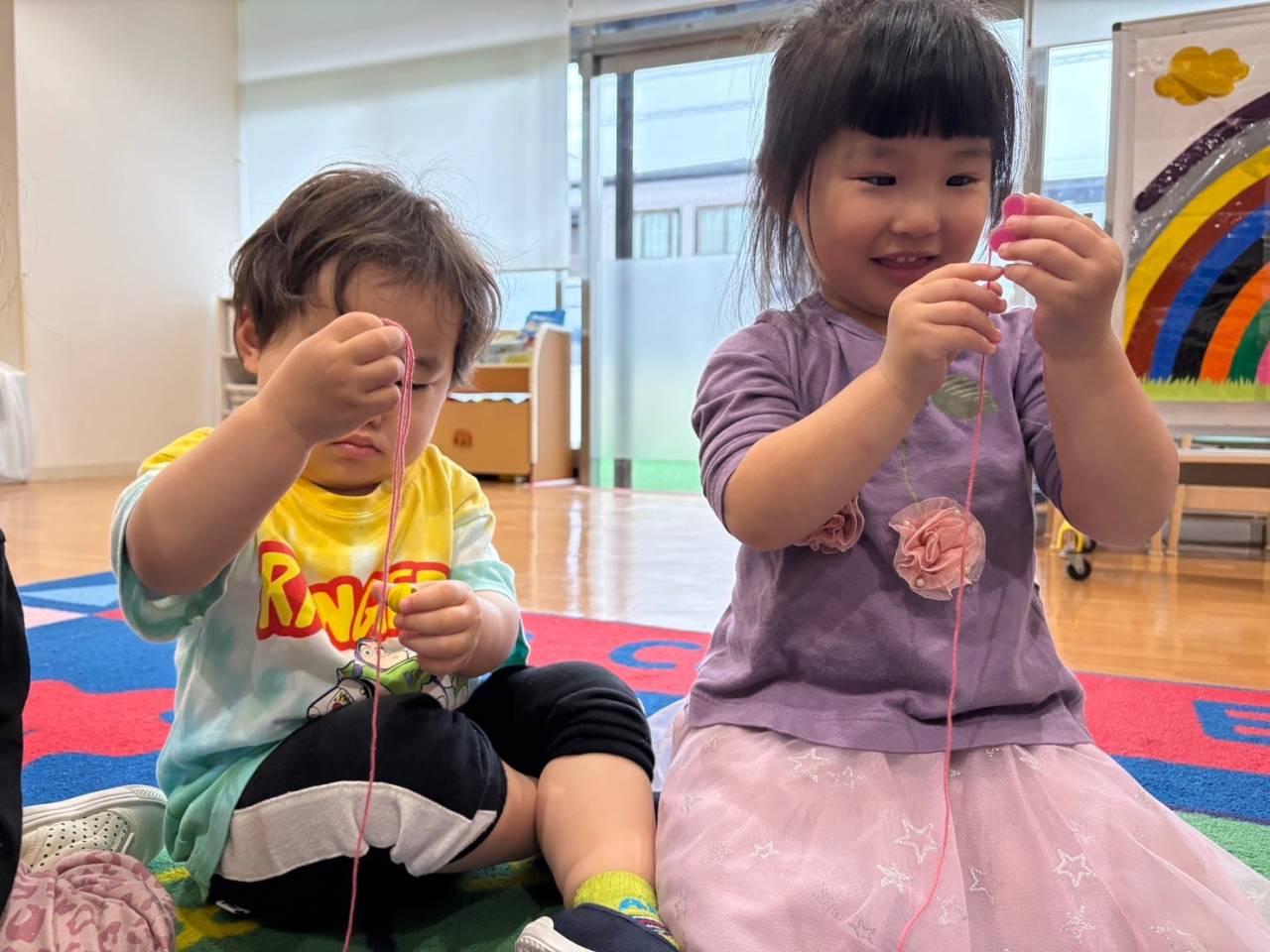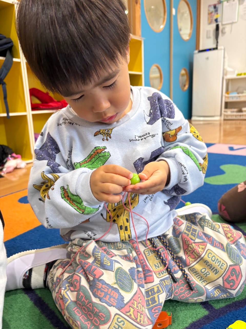 少し苦戦している様子のみんなでしたが、諦めずに自分で丁寧に紐を通していました!