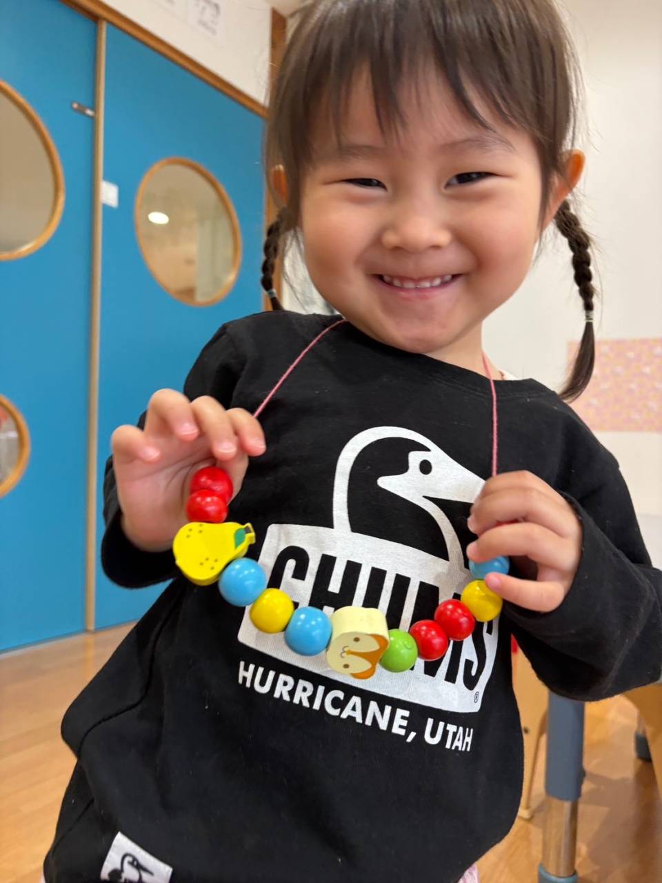 一人1本ずつ紐を渡して、好きなビーズを紐に通して遊んでもらいました。