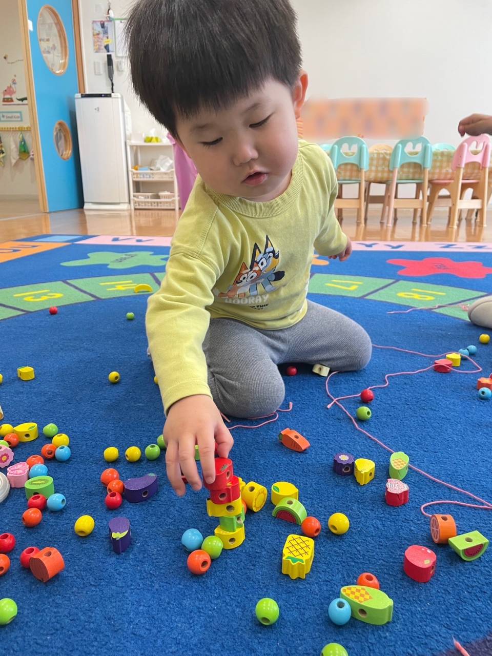 紐を通すだけではなく、ビーズ同士を積み上げて遊ぶ様子も見られました♡